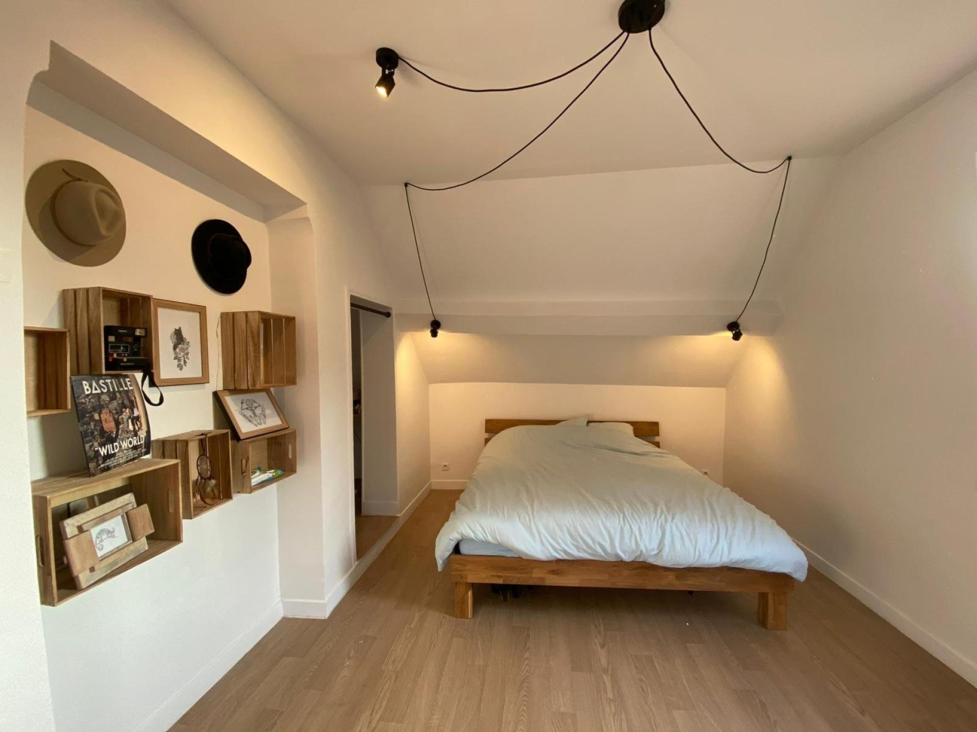 A l’étage : une chambre, un espace dressing et un espace bureau.