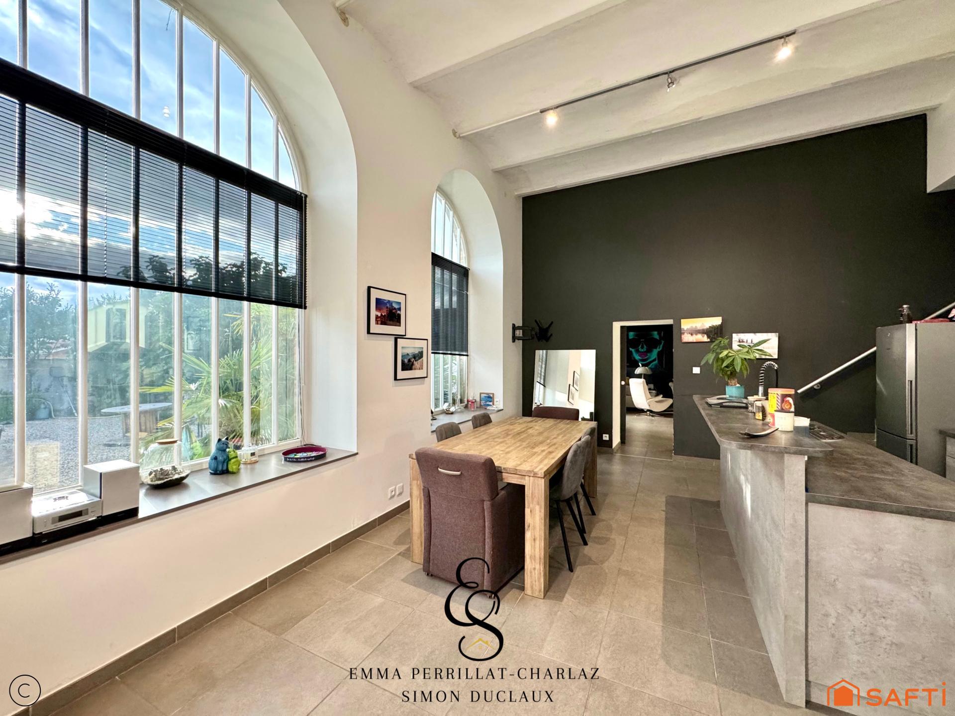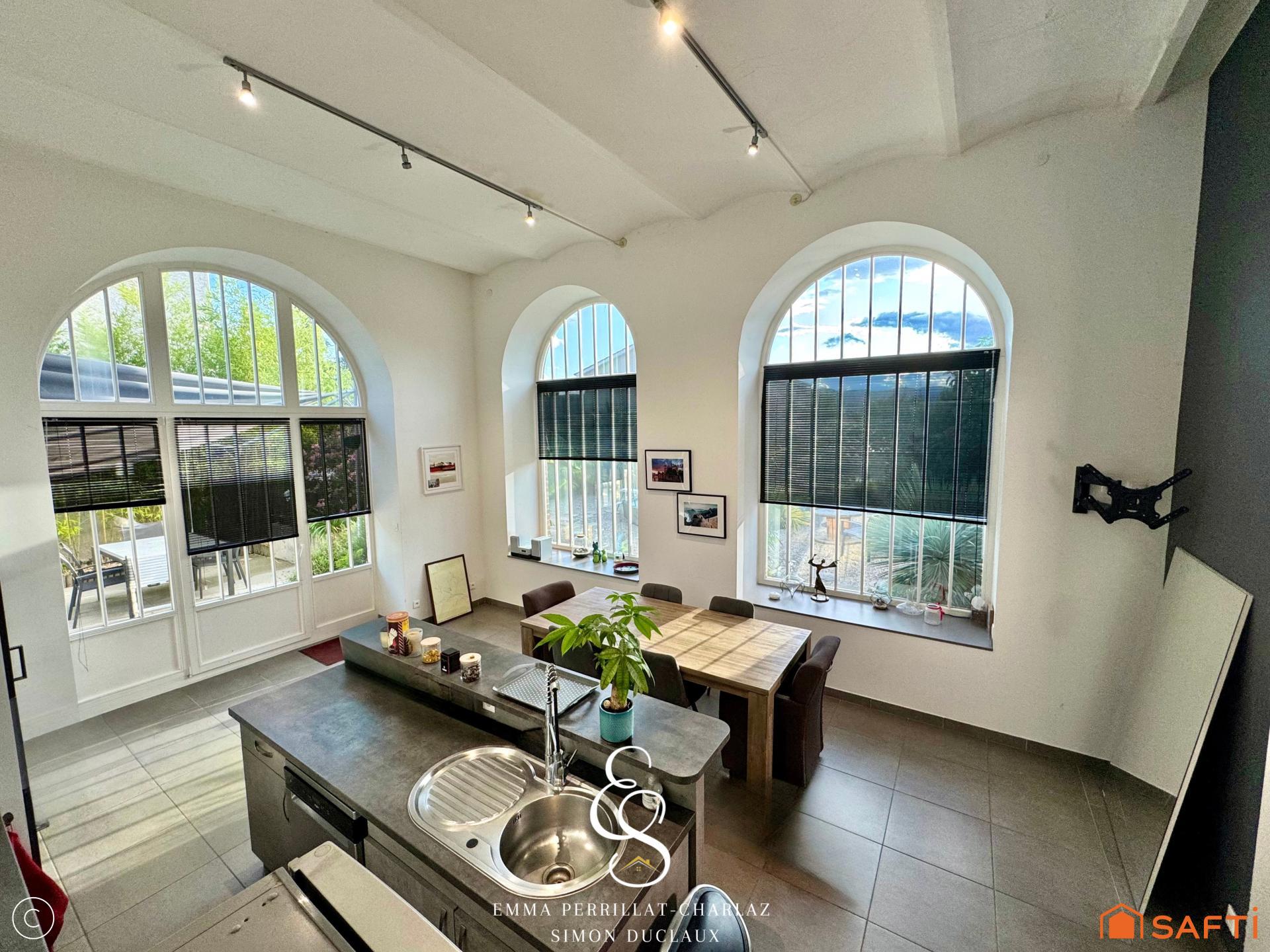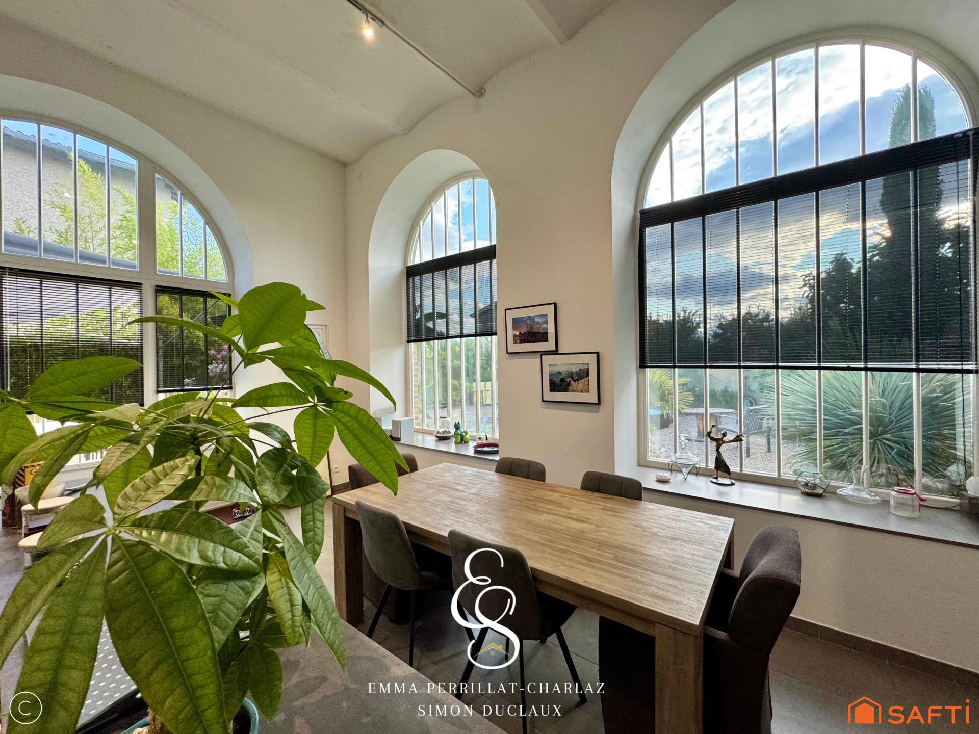 À l’intérieur, cette maison entièrement rénovée en 2015 dévoile un style résolument atypique. Les plafonds voutains majestueux culminant à 4,20 mètres et les superbes verrières apportent une luminosité et une sensation d’espace rares, conférant une ambiance chaleureuse et élégante.