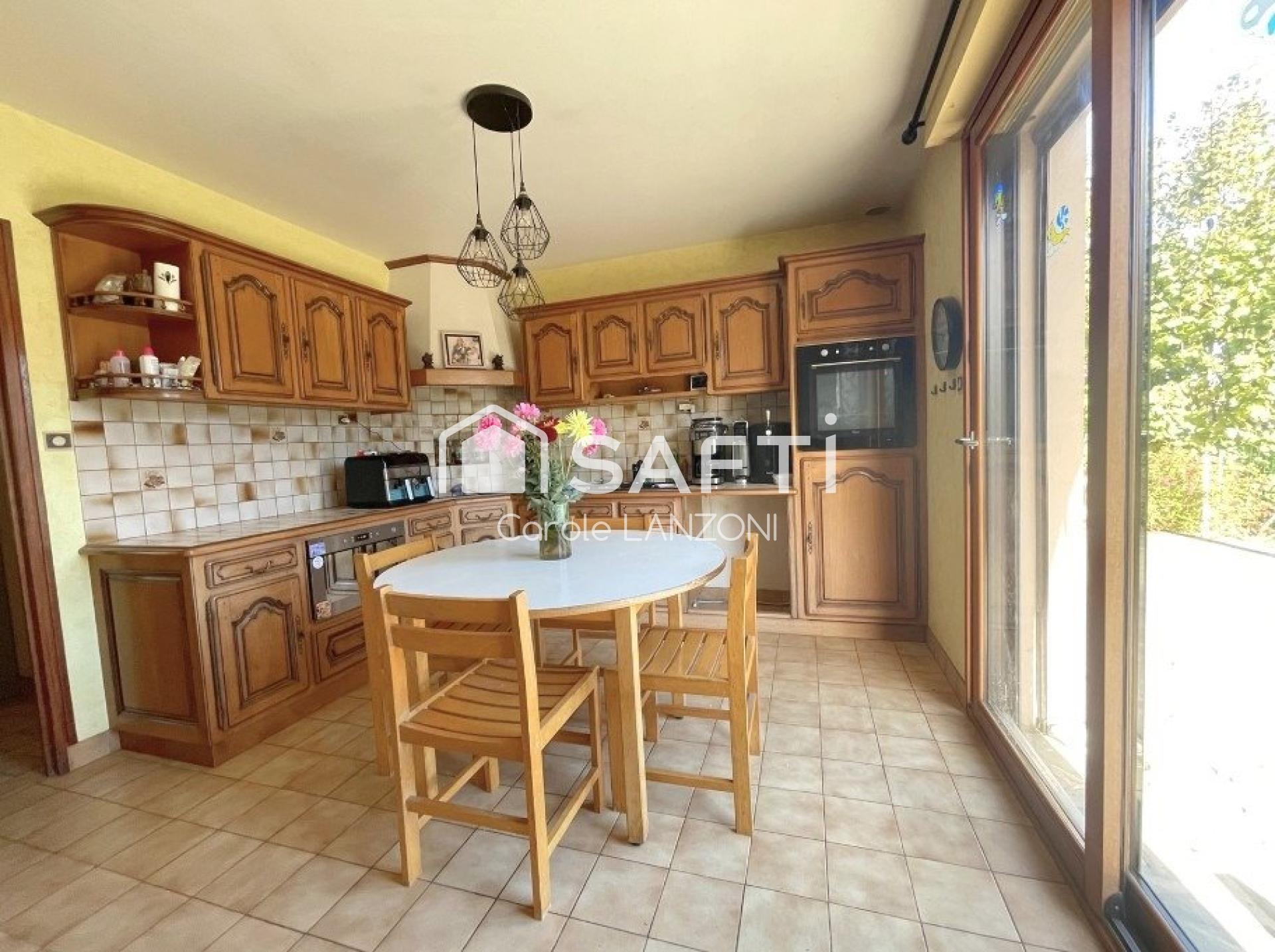 Au rez-de-chaussée, une pièce de vie baignée de lumière, une salle à manger chaleureuse et une cuisine équipée invitent aux moments partagés.