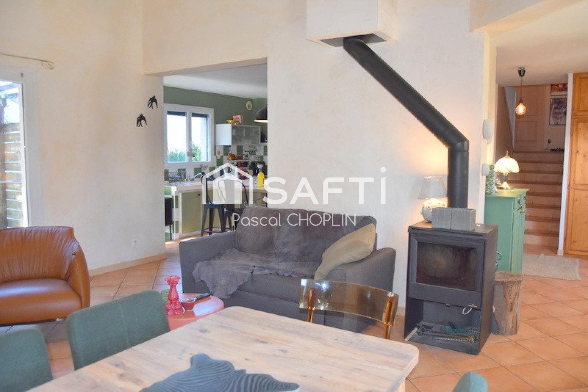 Le hall d’entrée, avec penderie, dessert un séjour/salon, agrémenté d'un poêle à bois, ainsi qu’une cuisine ouverte équipée, offrant accès sur les terrasses et un cellier.