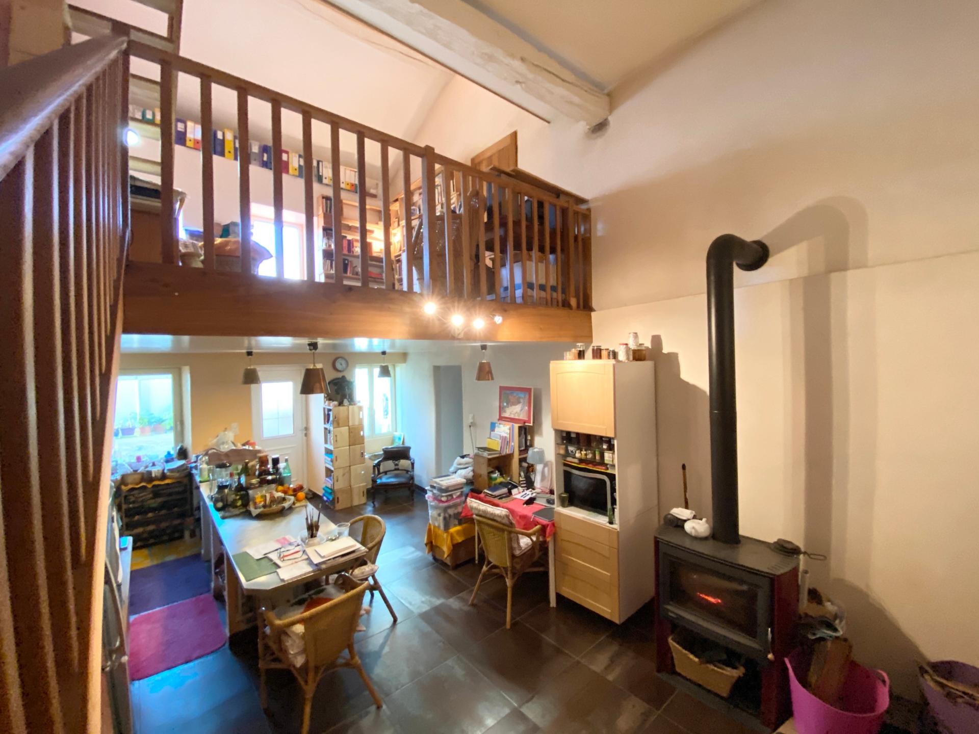 Maison de bourg avec grande grange et plusieurs dépendances. Jardin face à la maison avec un garage/atelier, ainsi qu'un ancien four à pain (à restaurer). La maison est raccordée au tout à l'égout, l'ensemble des menuiseries en aluminium et double vitrage. Commodités et école primaire à proximité. Environnement calme, plusieurs sentiers de randonnées autours avec bois et prairies. Deux grands terrains, un verger en biodynamie, l'autre en bois de chauffage (environ 600 m2 non attenants). Maison très bien restaurée et isolée, à basse consommation énergétique (murs de 80). Chauffage mixte bois/électrique (si besoin). Belle véranda double vitrage/aluminium en entrée (destinée à réchauffer toute la maison). Chambre avec salle de bain attenante, cuisine américaine (ouverte sur séjour), réserve pour stockage (accès grange). Deux mezzanines (espace bureau et chambre d'appoint). Possibilité d'un loft (eau et électricité en place, accessible au premier).