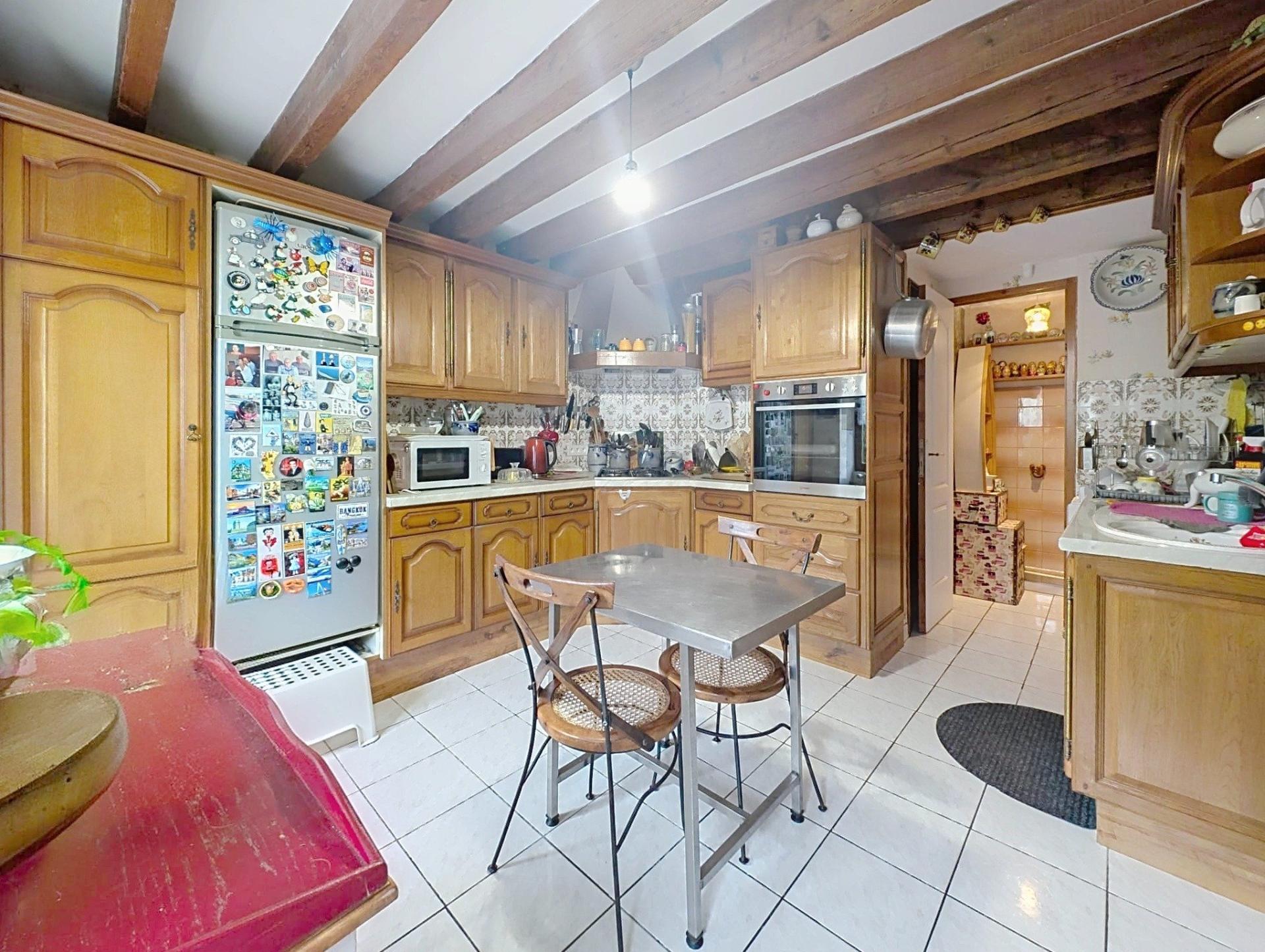 Le rez-de-chaussée se compose d'une pièce de vie de 30m2 avec ses poutres et sa cheminée à foyer fermé, d'une cuisine dinatoire, aménagée et équipée et d'une salle d'eau avec WC séparé.