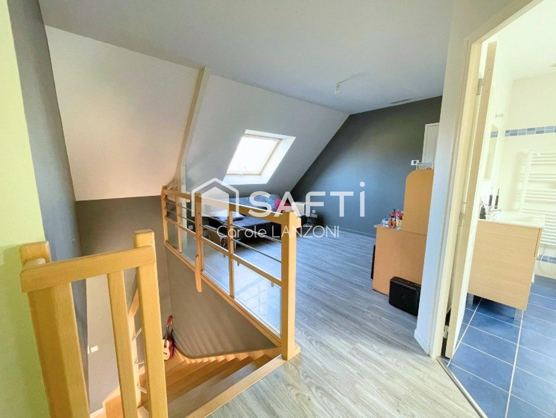 Au-dessus du garage, un volume d’environ 39 m² offre un potentiel d’aménagement. Le garage de 32 m², mitoyen, permet du stockage ou un atelier, avec un accès direct à la terrasse.
