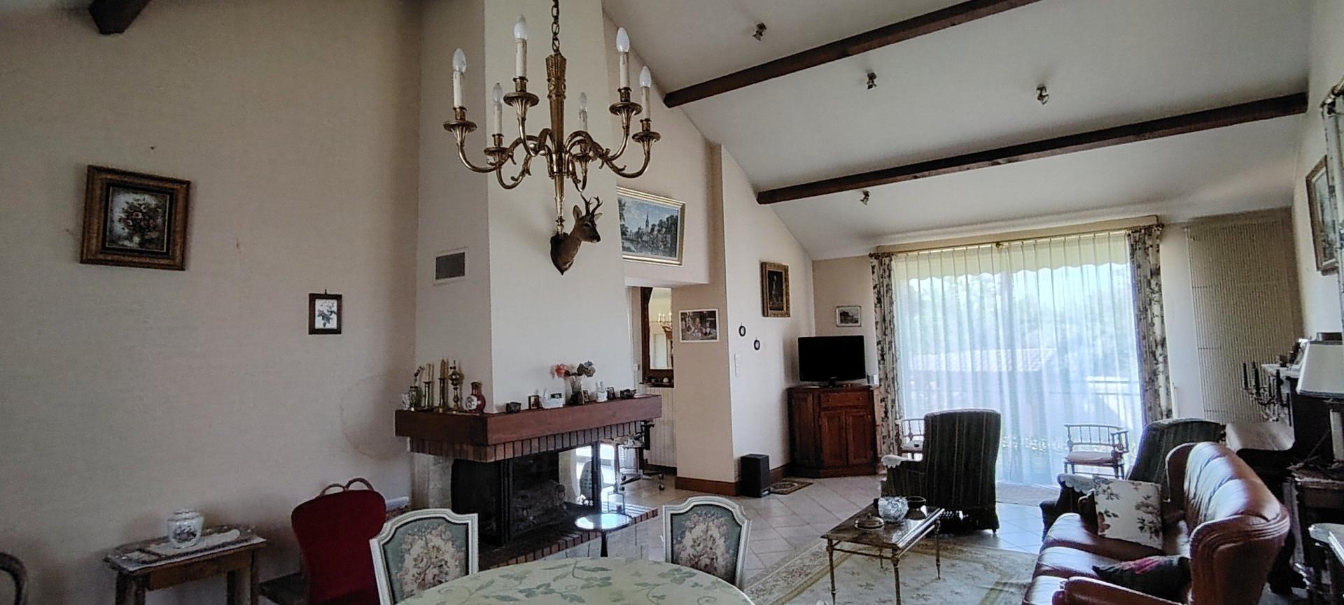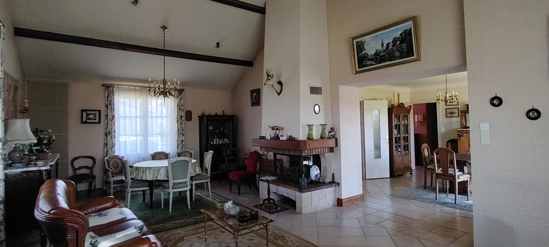 ?Espaces de vie : Une pièce de réception lumineuse de plus de 50 m² avec cheminée et insert pour vos soirées d'hiver.