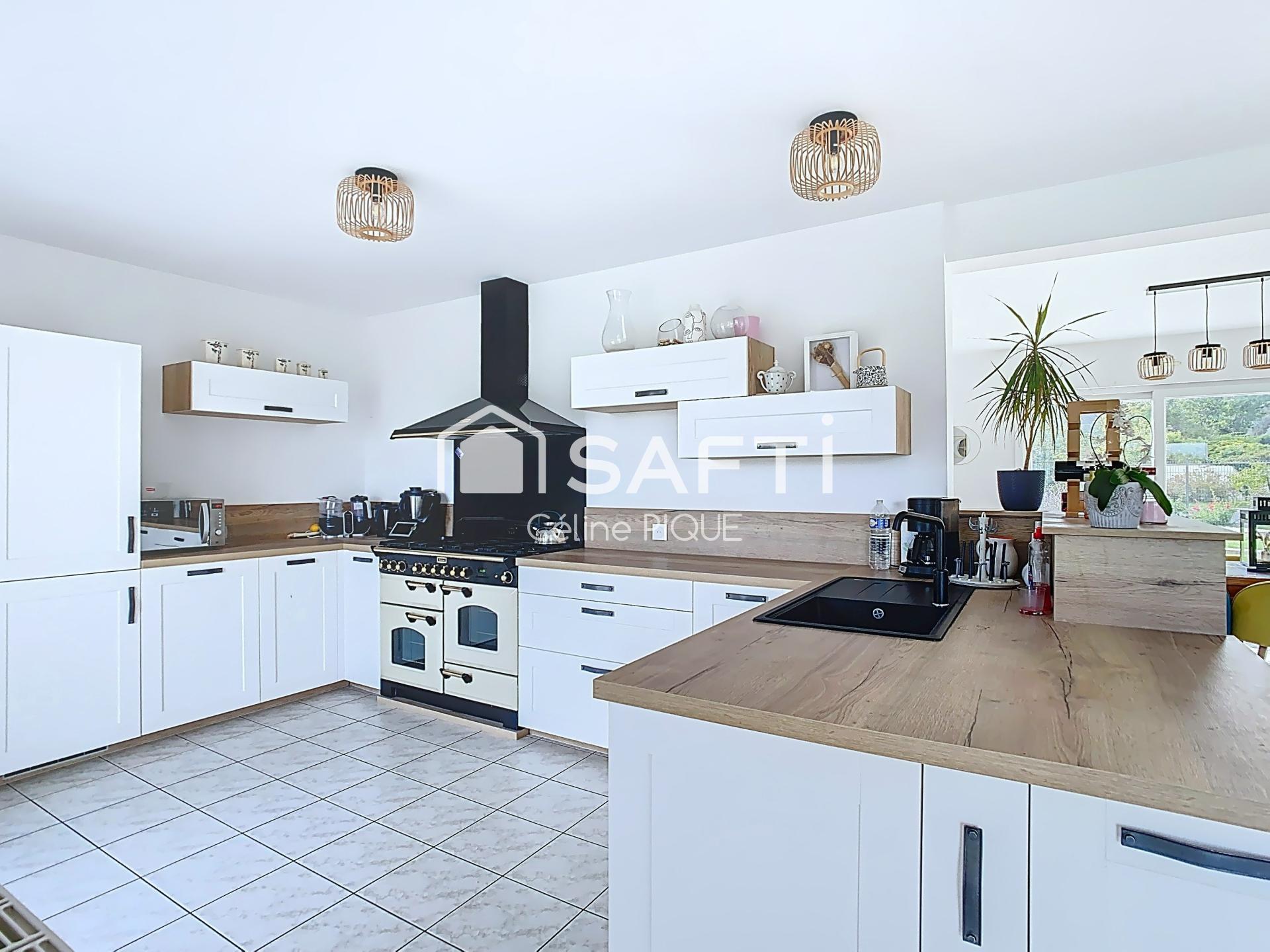 Elle offre 9 pièces principales et comprend au rez-de-chaussée : une entrée avec une porte récente et un placard, un séjour lumineux de 40 m², une cuisine ouverte de 15 m² entièrement refaite en 2022 profitant d'un piano de cuisson, une arrière-cuisine/buanderie, un salon de 50 m² construit dans une extension de 2007, ainsi qu’une chambre de 15 m², une grande salle d’eau et un wc indépendant permettant une vraie vie de plain-pied.