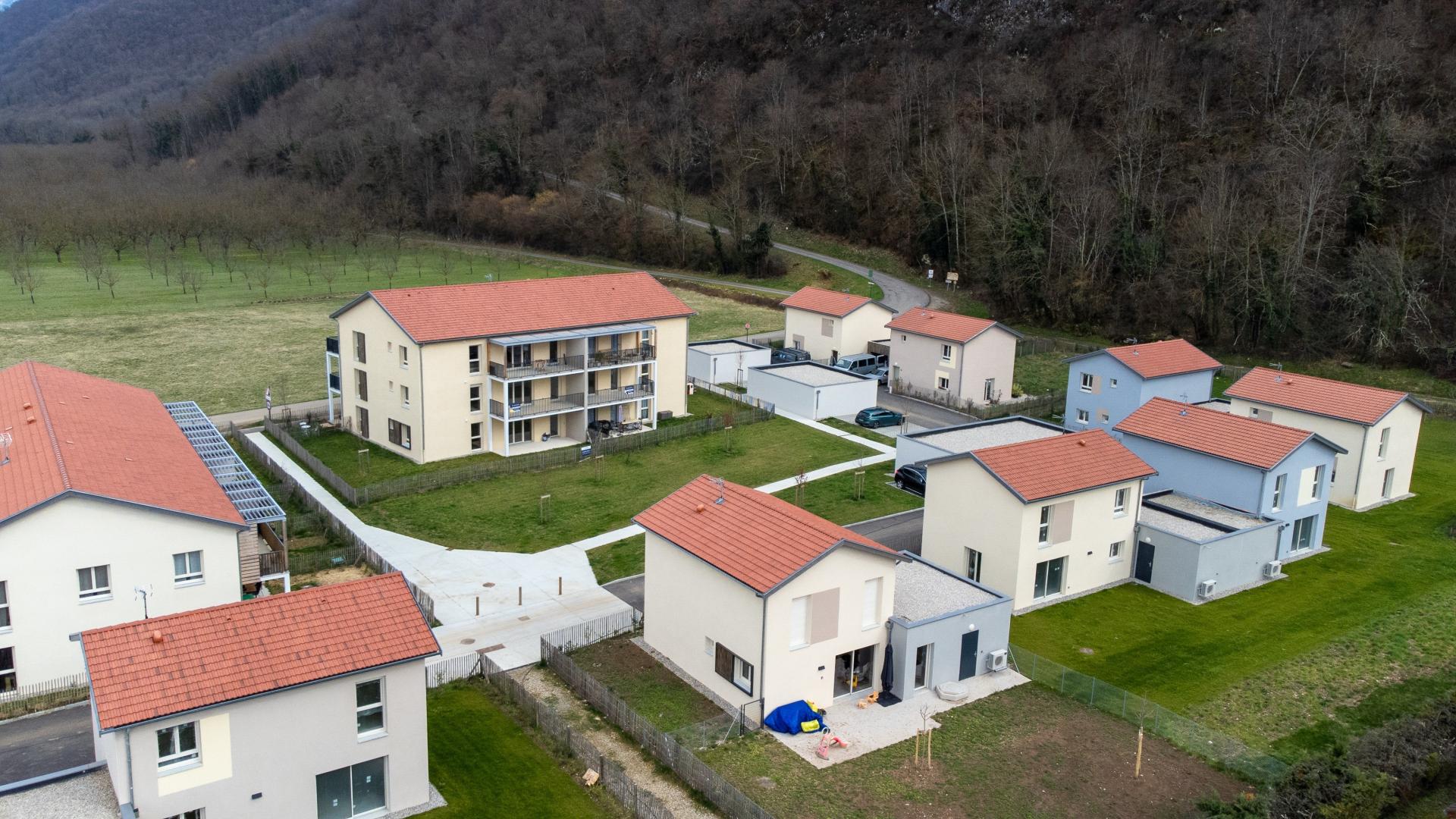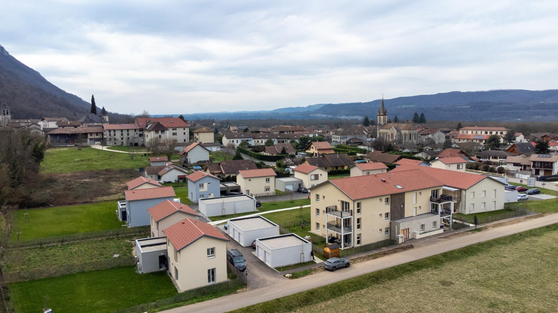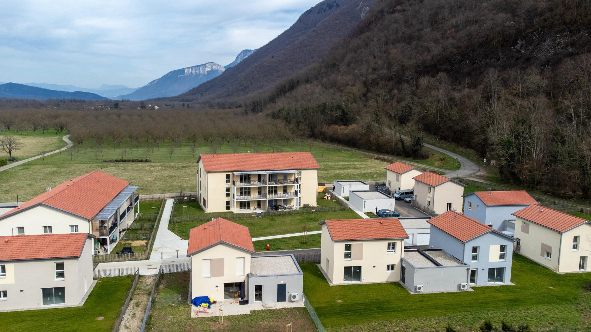 Etalé sur près d’un hectare, « ESPRIT VILLAGE » est un lotissement de 10 maisons individuelles, 8 logements intermédiaires T3 et 12 logements collectifs du T2 au T4, organisées autour d’un espace central paysager (résidence privée sans logements sociaux).