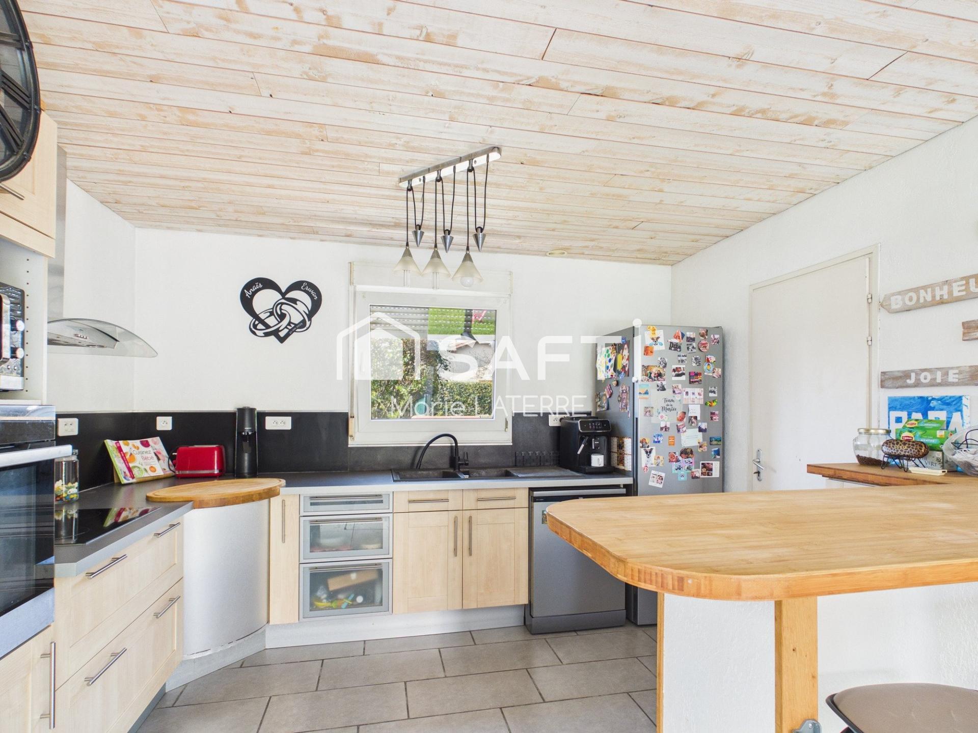 Dès l’entrée, vous découvrirez une cuisine aménagée ouverte sur un lumineux séjour, créant un espace de vie convivial et chaleureux, avec un accès direct à la terrasse et au jardin, parfait pour vos moments de détente en extérieur.