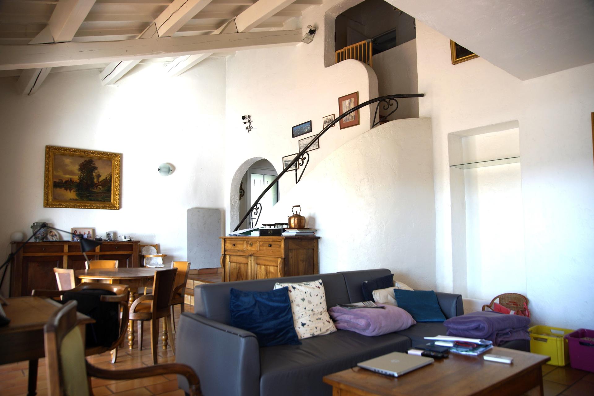 - d’une entrée avec WC, donnant accès à une cuisine et un spacieux salon-séjour cathédrales, équipé d’une cheminée.