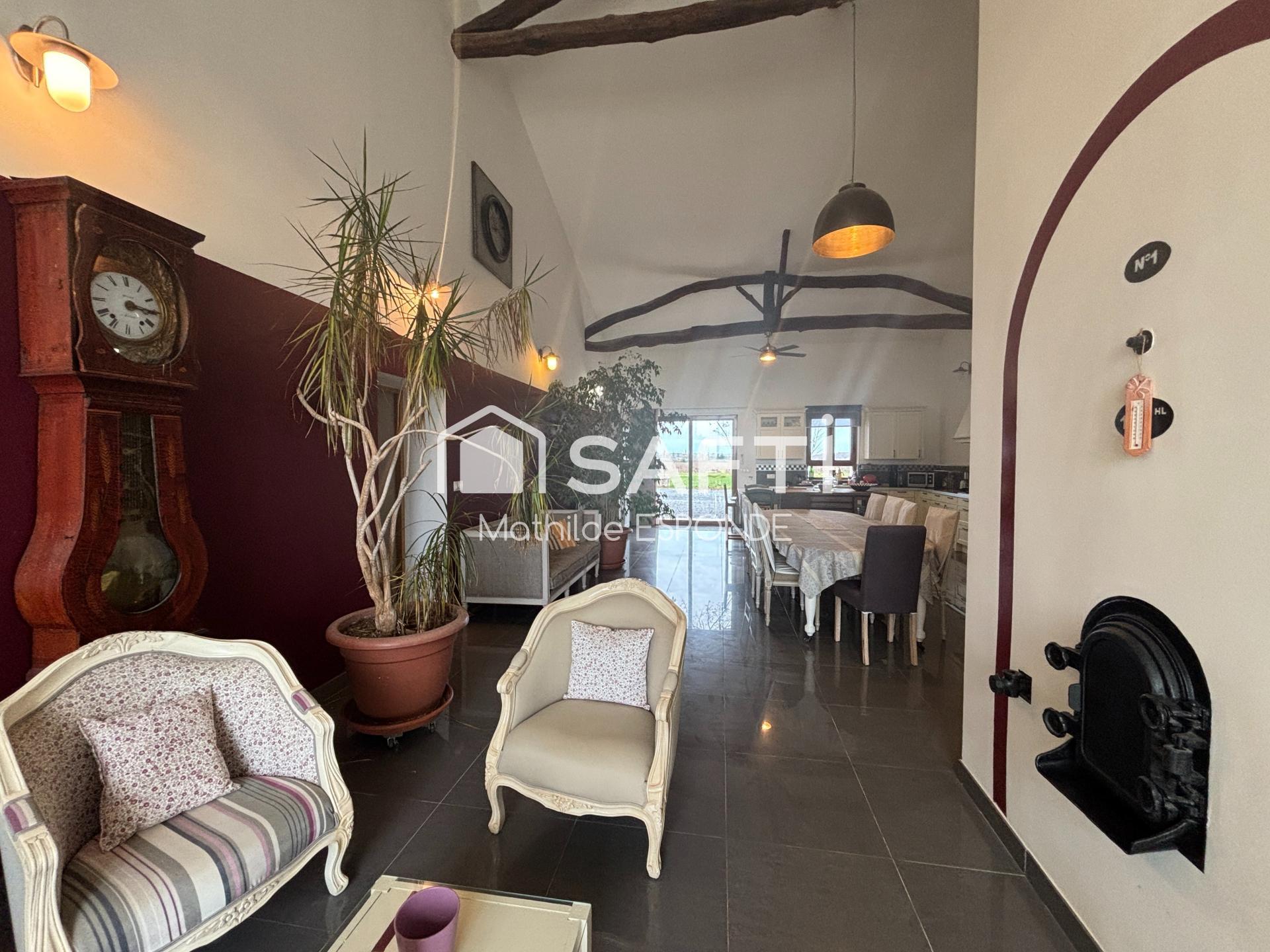 La maison principale, entièrement rénovée d'environ 279 m², séduit par ses volumes généreux et une distribution harmonieuse : un salon/ bibliothèque, un bureau indépendant et une superbe pièce de vie d'environ 75 m² (avec cuisine américaine équipée, insert et salle à manger) satisferont toutes vos envies. Des wc et un espace buanderie confectionné dans les anciennes cuves à vin confirmes la fonctionnalité du lieux.