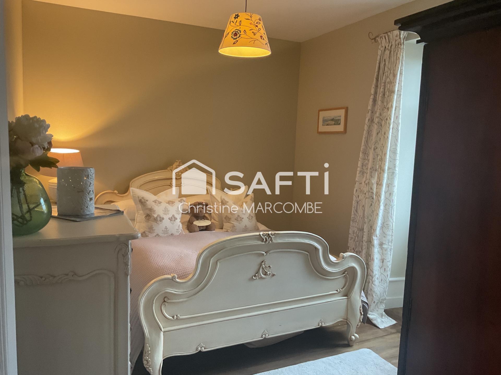 À l’étage, la maison propose trois belles chambres, dont une suite avec sa salle d’eau privative, ainsi qu’une salle de bain complète, formant un espace nuit parfaitement organisé.