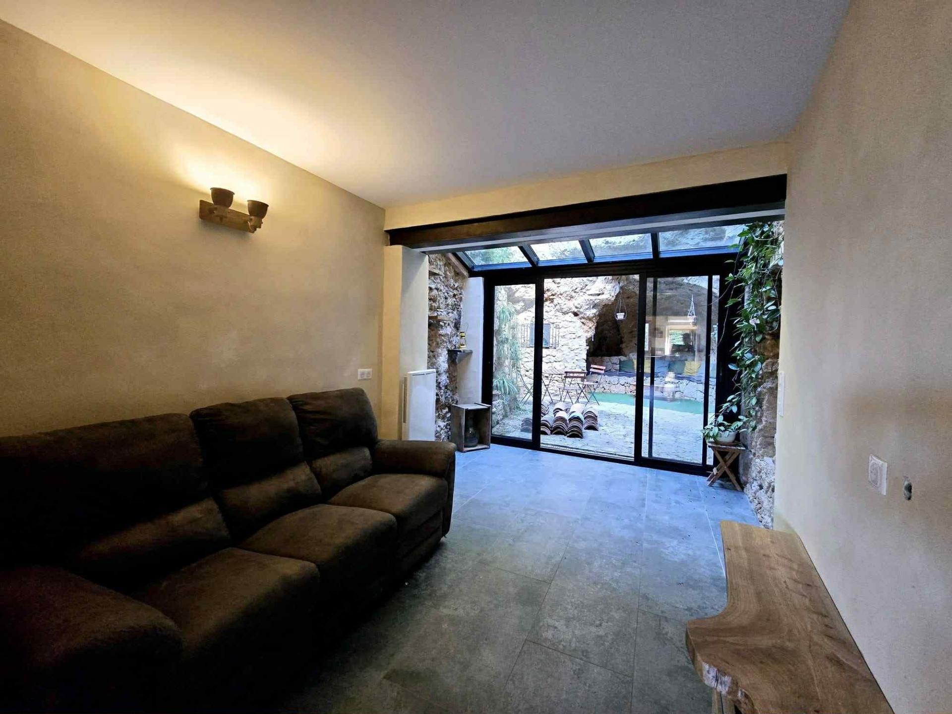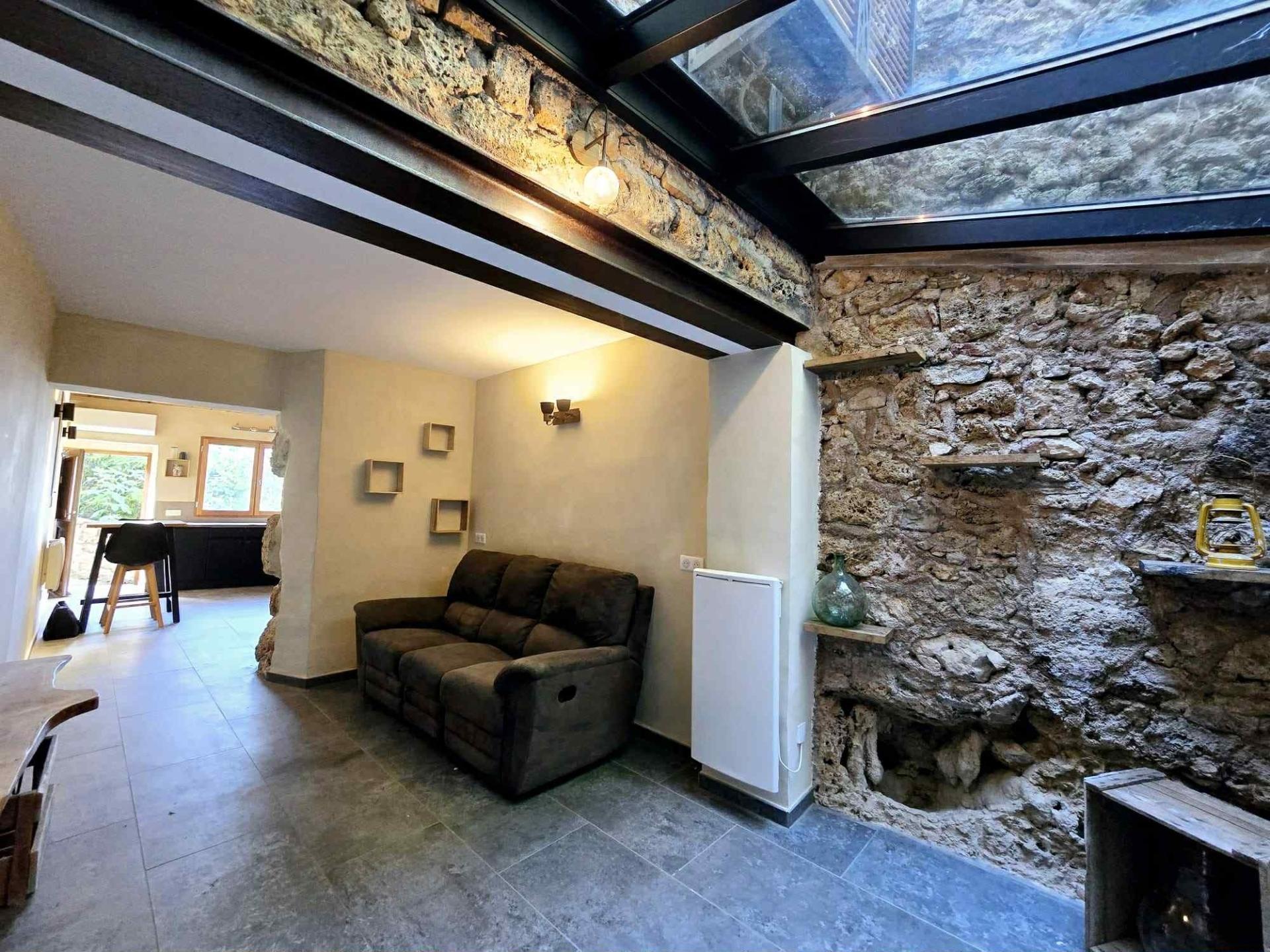 - Au rez-de-chaussée : cuisine, salon/salle à manger, une véranda donnant sur une cour intérieure avec deux coins "cosy" creusés dans la roche, dont un qui peut être aménagé en chambre ou autre...