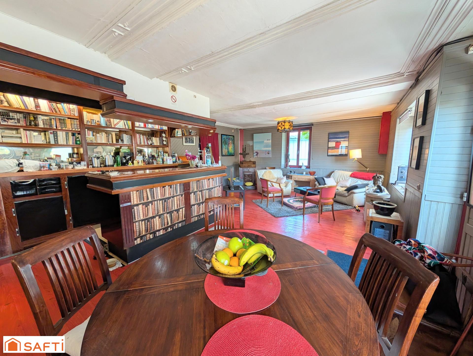 Dès l'entrée, une agréable terrasse en façade vous mène à une spacieuse pièce à vivre de 42 m² env. (l'ancienne salle du restaurant). Doté d'un bar, cet espace offre un potentiel incroyable pour organiser des réceptions ou pour créer un salon familial généreux et accueillant.