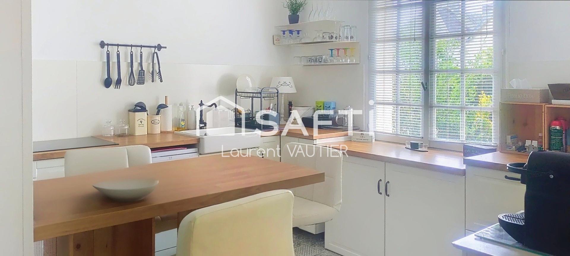 À l'intérieur, cette maison de 130 m² propose au rez de chaussée une cuisine équipée, un séjour/salon, une chambre avec salle de bains, un bureau et un wc. A l'étage, deux chambres, un bureau et une salle d'eau avec douche et wc.