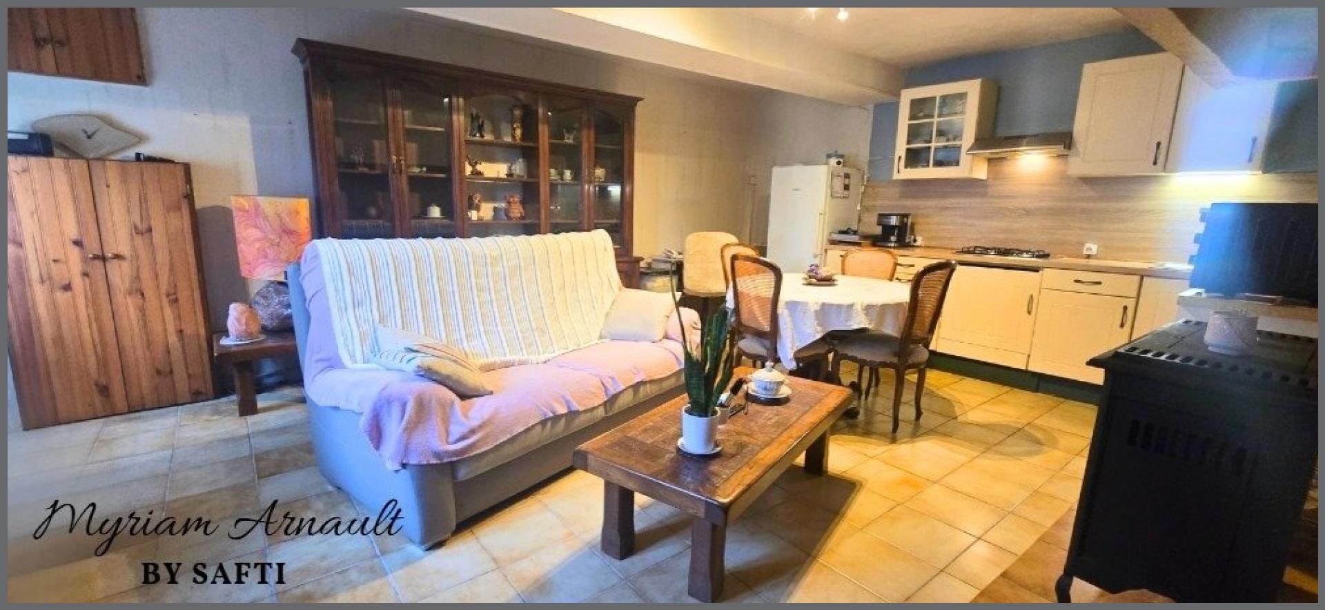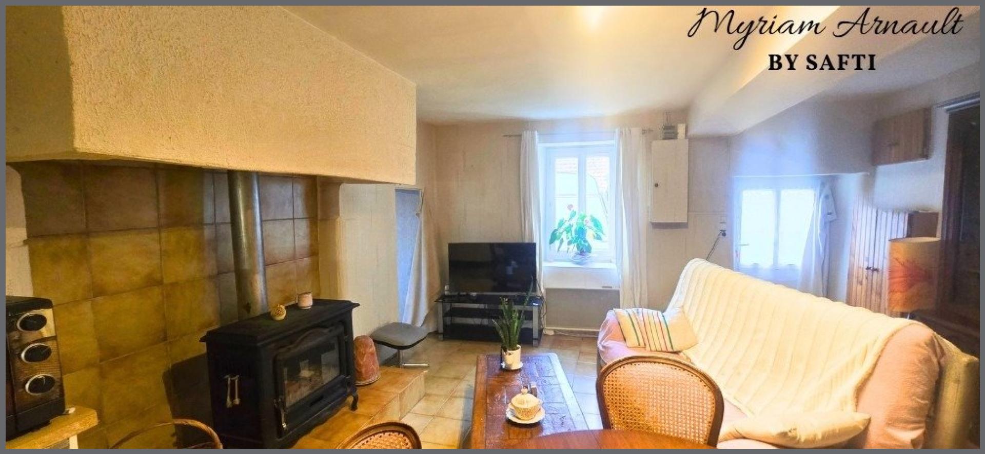 Une pièce principale chaleureuse, agrémentée d'un insert à bois et d'une cuisine ouverte.