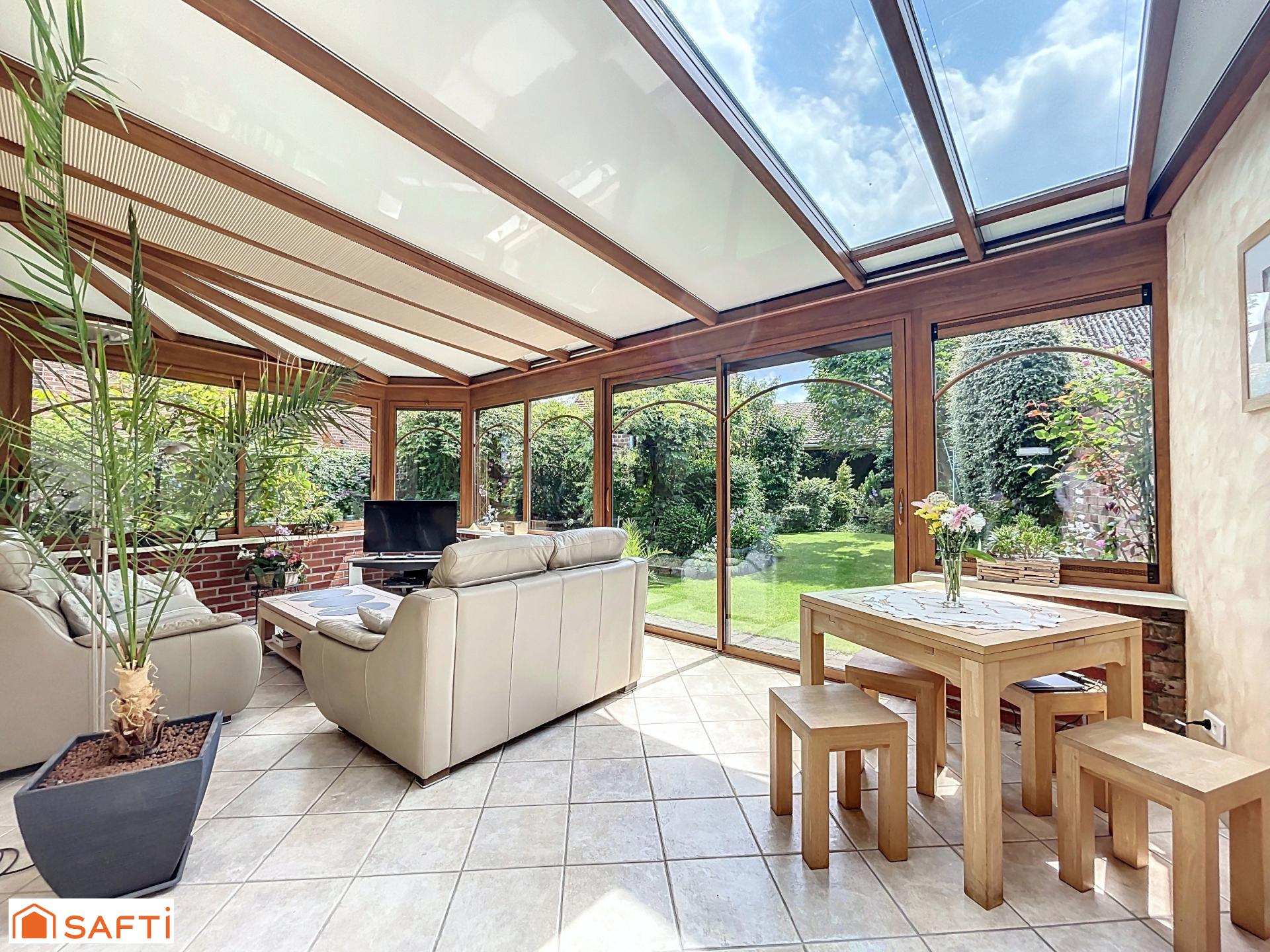 Dès l’entrée, vous serez séduit par un grand salon chaleureux, équipé d’un insert à feu de bois. La maison offre également une cuisine aménagée et équipée, ouverte sur une spacieuse véranda de 22 m², exposée sud-ouest, offrant une vue dégagée sur un magnifique jardin sans vis-à-vis.