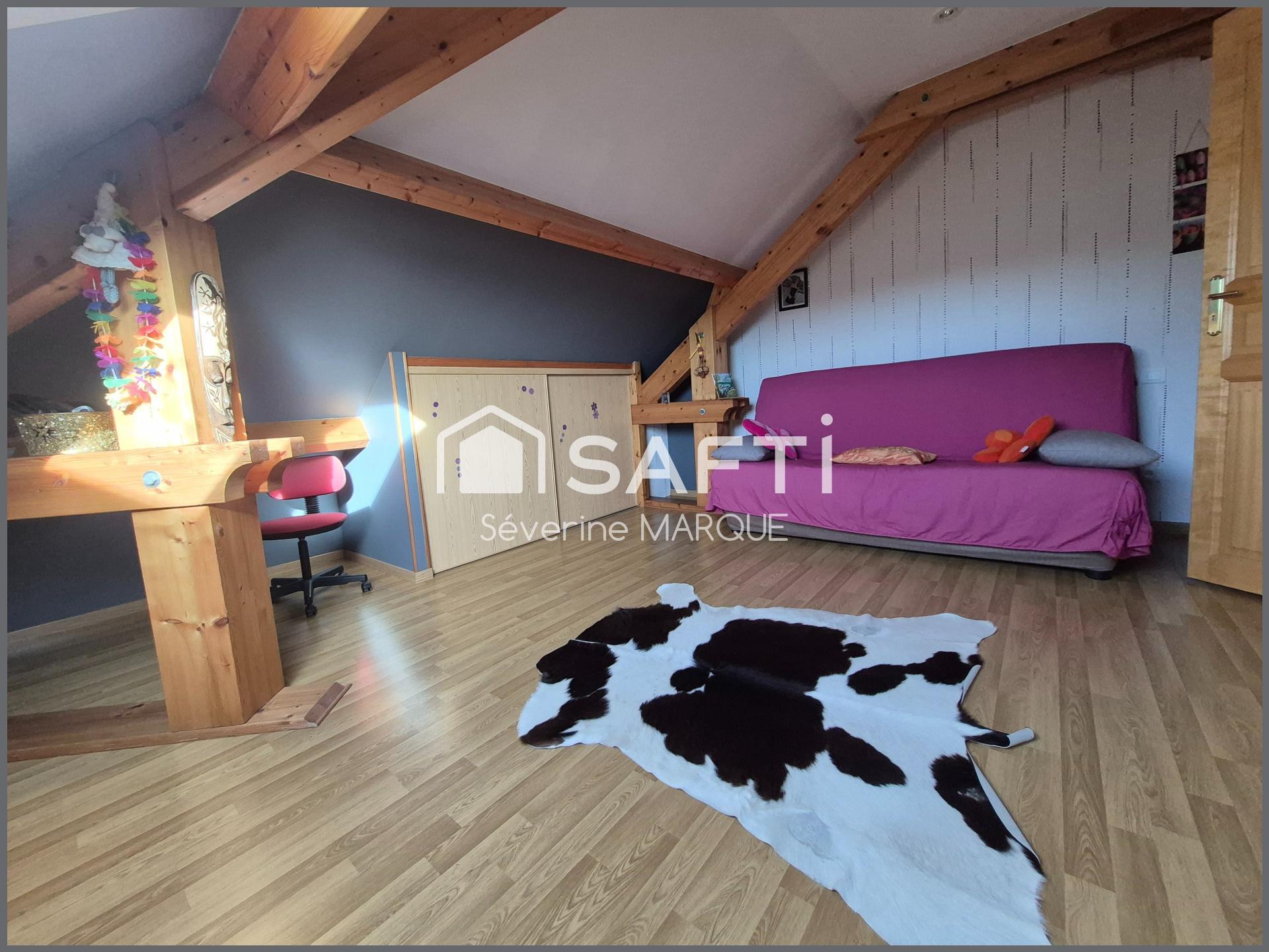 L'étage avec sa charpente apparente abrite deux chambres avec rangements, un espace bureau, un WC et une salle de bain à terminer.