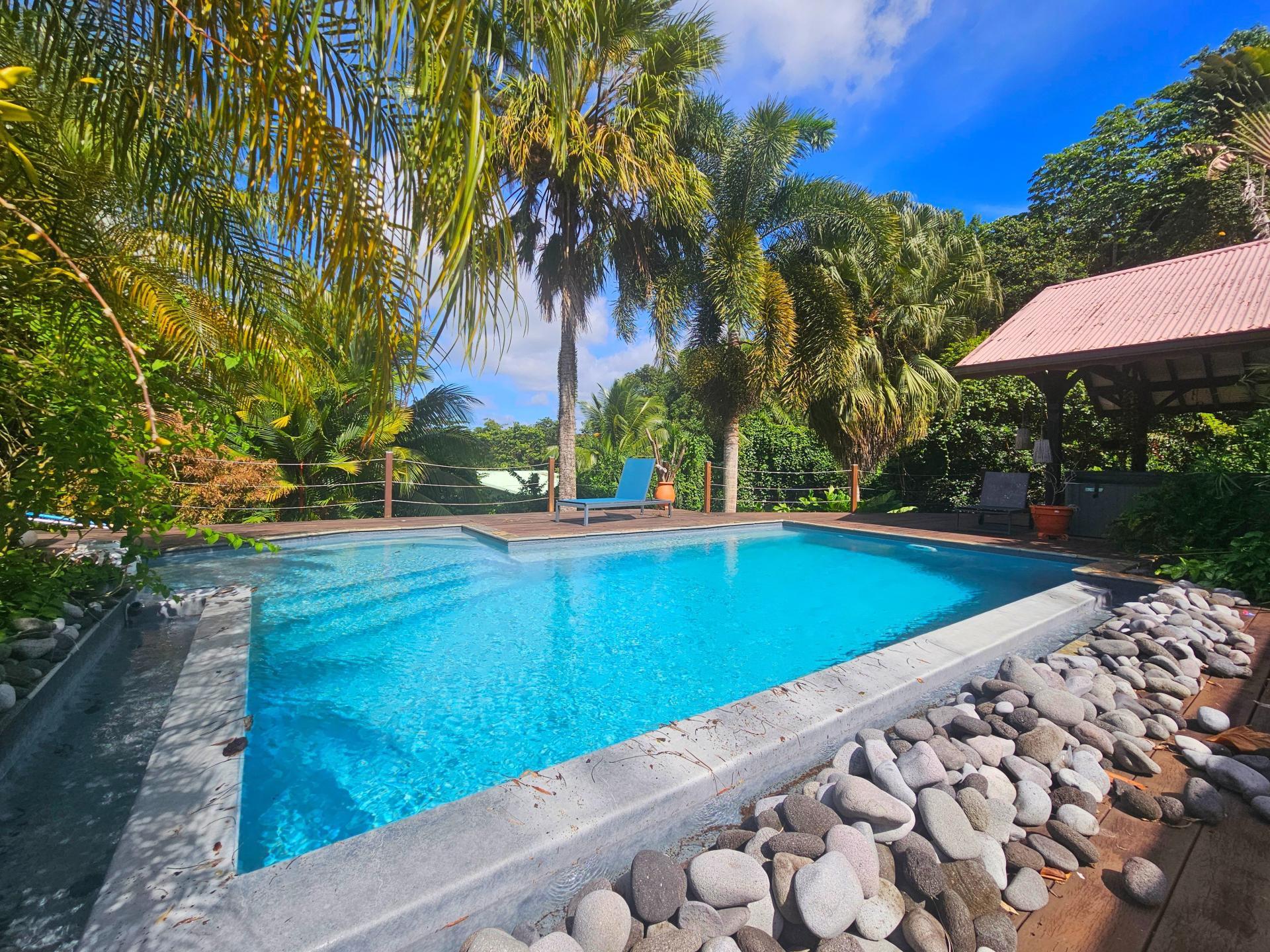 De vastes terrasses entourent la maison et mènent à une belle piscine, idéale pour profiter du calme et de la nature.