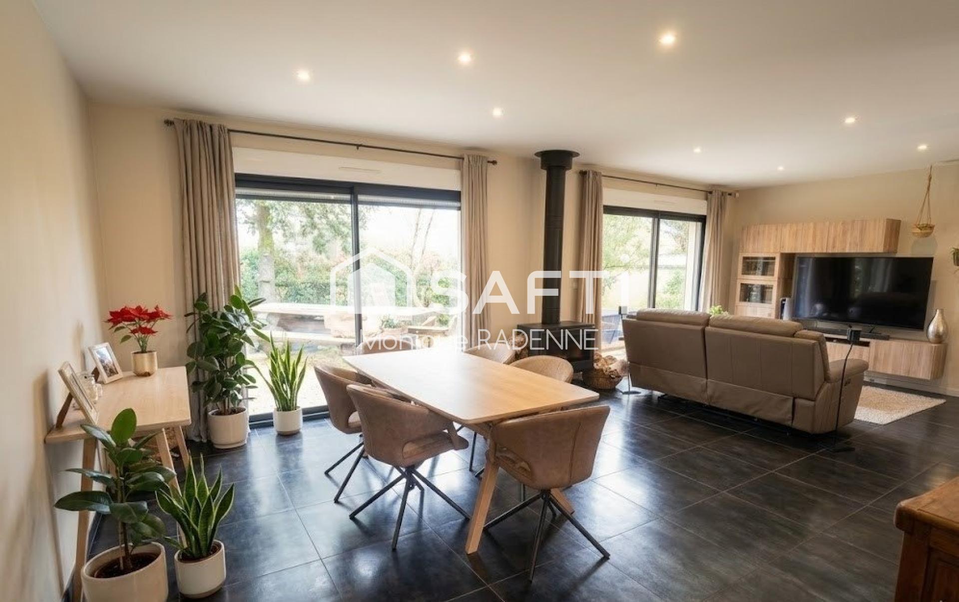 À l'intérieur, la maison de 110 m² se compose de 5 pièces dont 3 chambres, chacune équipée d'un dressing, offrant ainsi des espaces de rangement pratiques. Le séjour est agrémenté d'une cheminée, créant une atmosphère chaleureuse ouverte sur la cuisine équipée, la salle de bains moderne avec douche italienne et chauffe-serviette apportent confort et fonctionnalité au quotidien. Les sols en parquet et carrelage ainsi que les menuiseries en double vitrage contribuent à l'aspect soigné et confortable de cette demeure.