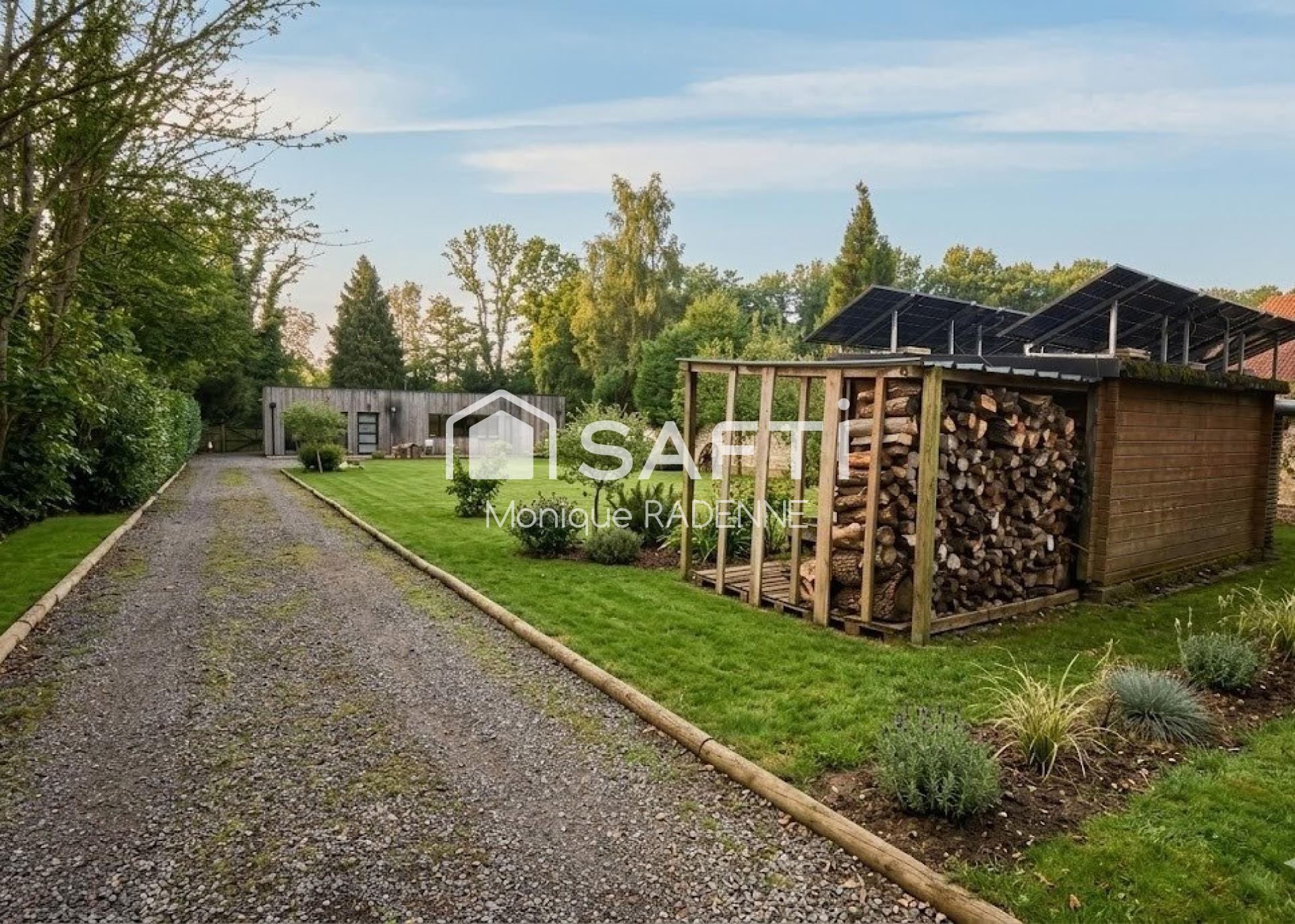 La propriété s'étend sur un terrain entièrement constructible de 2316 m² sans vis à vis, comprenant une terrasse de 50 m² pour profiter des beaux jours, des places de parking dont une couverte par un carport, offrant amplement d'espace pour les véhicules des résidents et des visiteurs. La façade en bardage bois et la structure en ossature bois confèrent un charme naturel à l'ensemble.