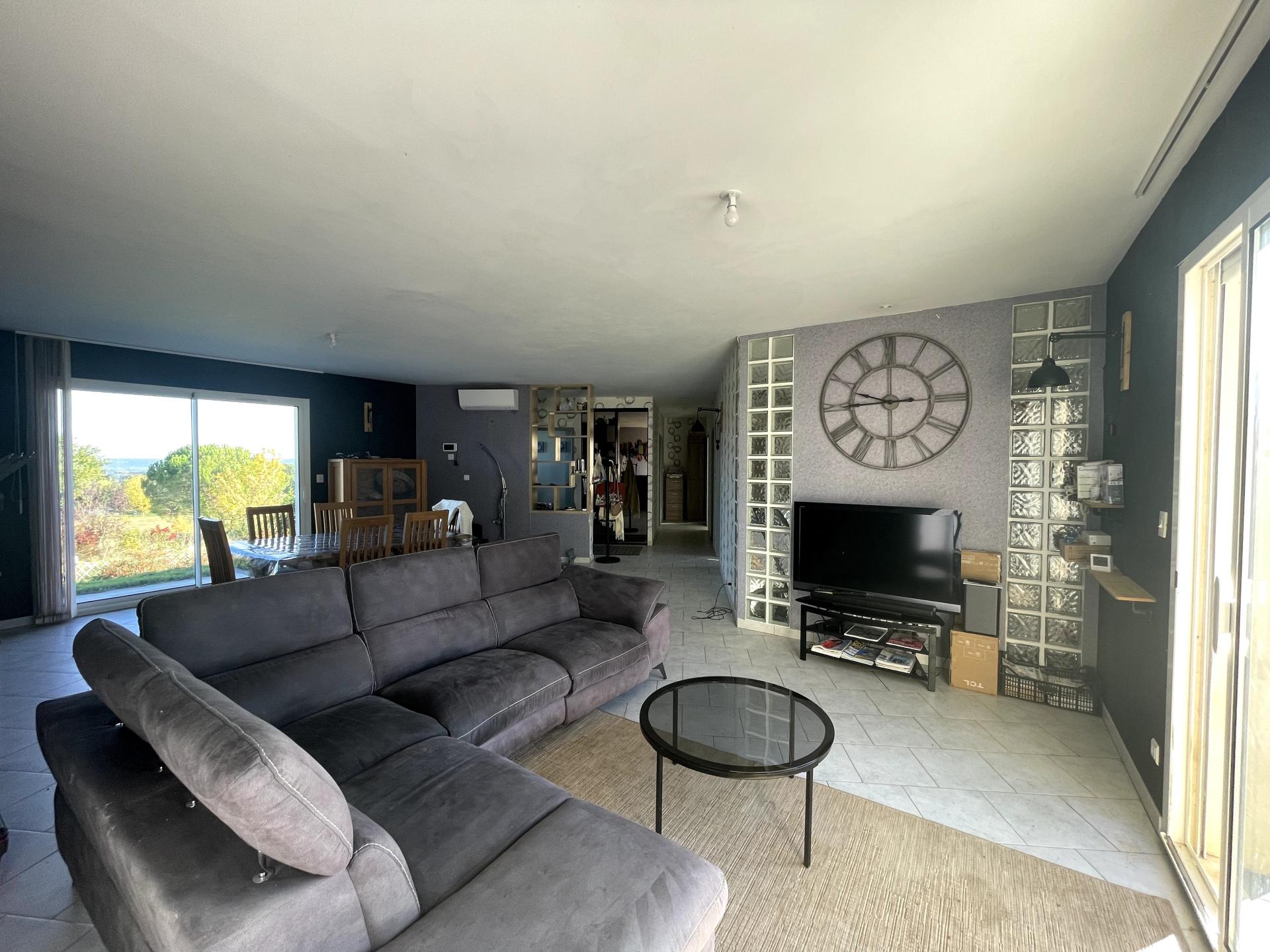 Son spacieux séjour de 46 m², avec poêle à bois et climatisation réversible, s’ouvre sur une grande terrasse partiellement couverte — un vrai lieu de vie convivial donnant sur la piscine au sel.