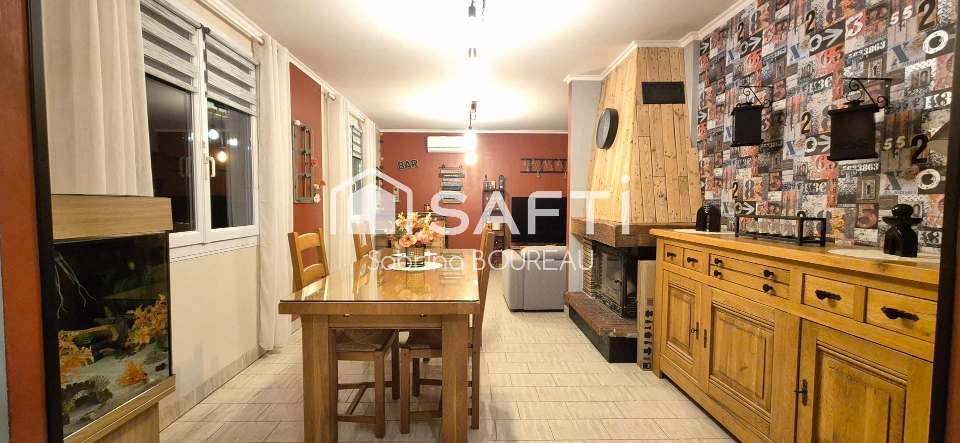 Un cellier-buanderie complète la partie habitable. À l’extérieur, vous apprécierez le garage attenant, le préau abrité idéal pour vos repas d’été en toute intimité, et le jardin clos de plus de 900 m², sans vis-à-vis.