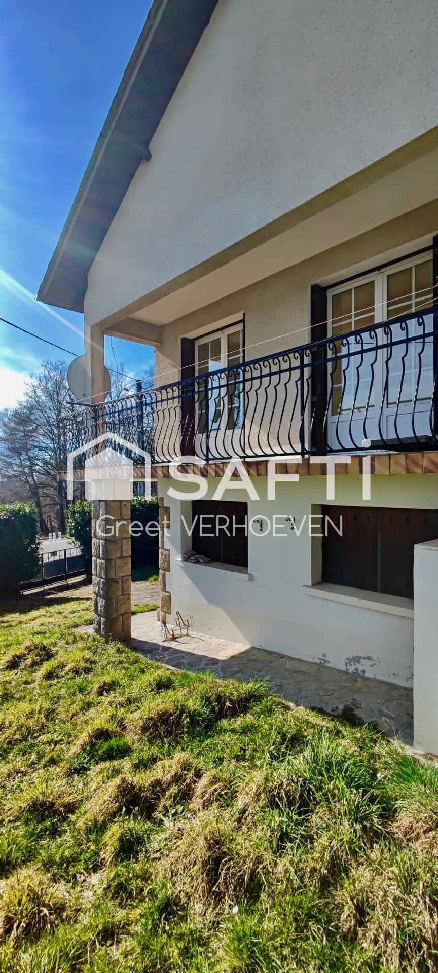 La maison dispose d'un balcon pour profiter de l'espace extérieur, d'une cave, et d'un garage. La façade en enduit et pierre, la toiture en ardoise et les menuiseries en double vitrage au premier étage complètent l'ensemble, offrant à la propriété un cachet traditionnel.
