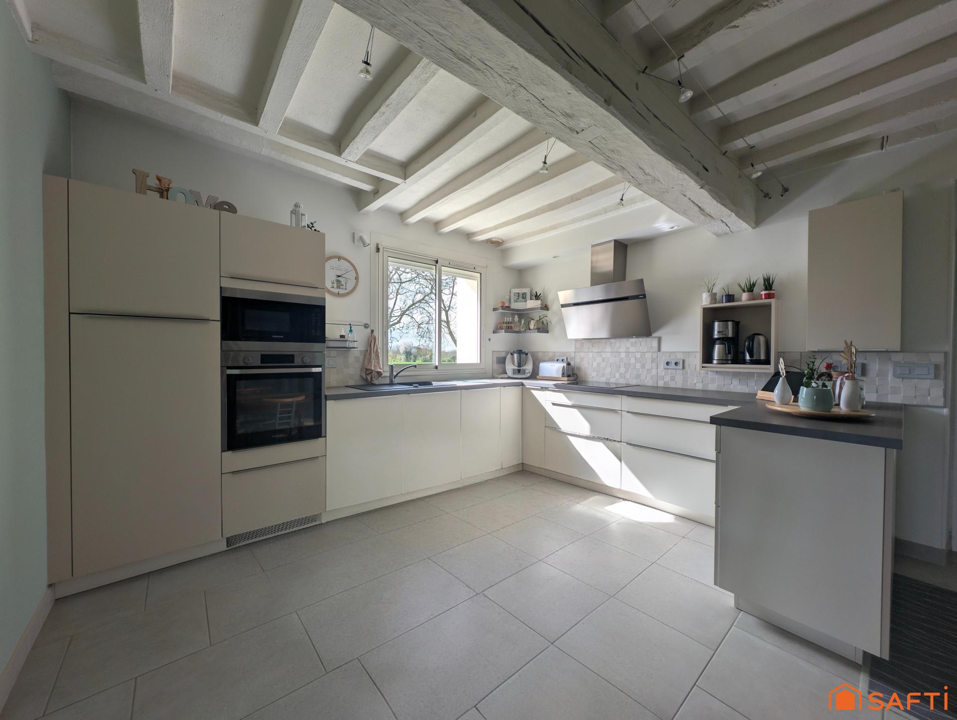 Nichée dans un environnement paisible, cette superbe longère de 160 m² allie avec justesse le charme de l’ancien et le confort contemporain.