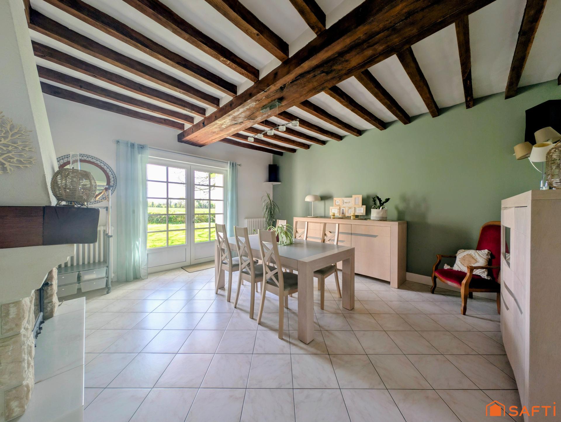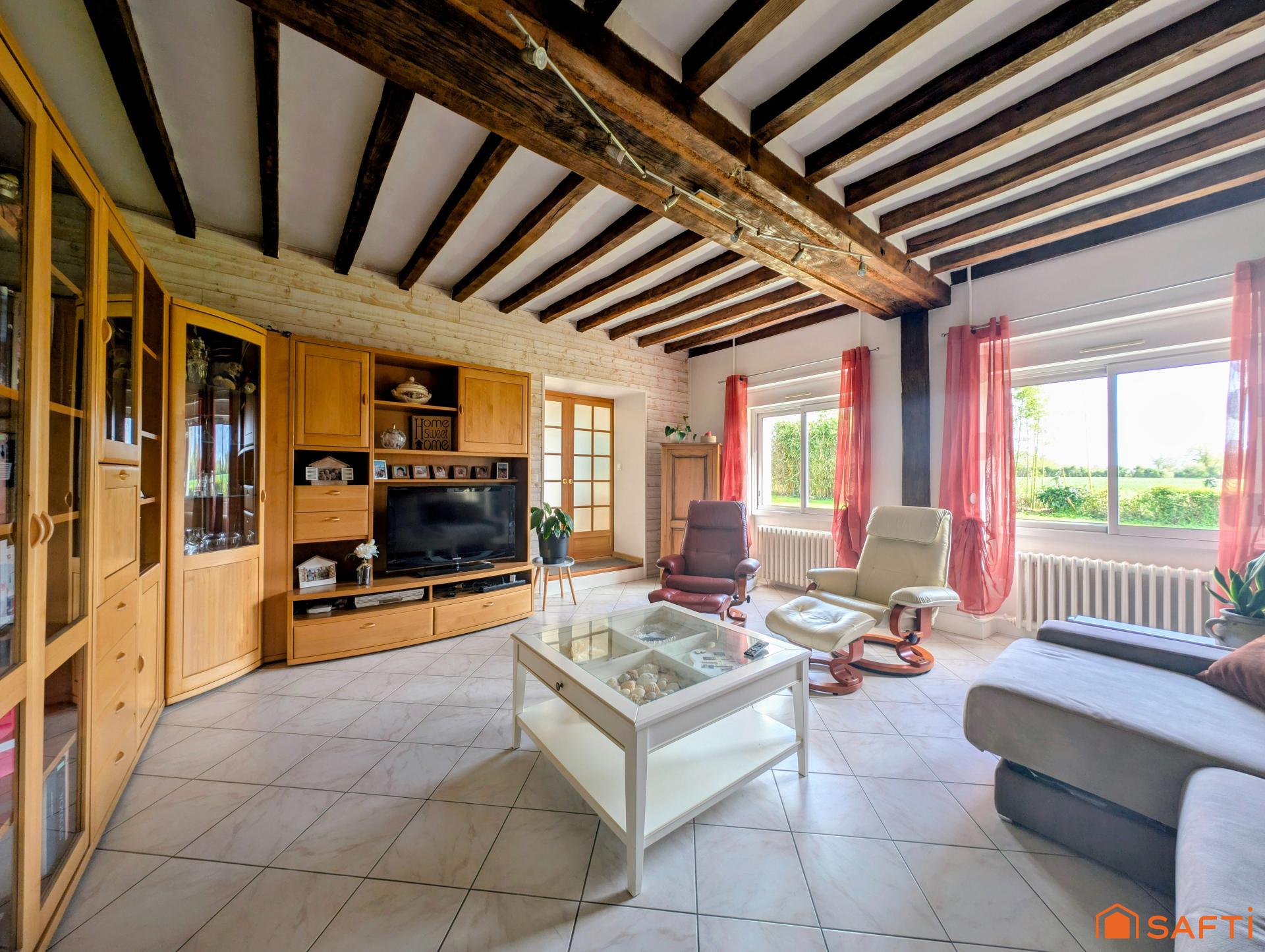 Poutres apparentes, parquet en chêne, prestations soignées et pompe à chaleur récente (2023) renforcent le caractère et le confort du bien.