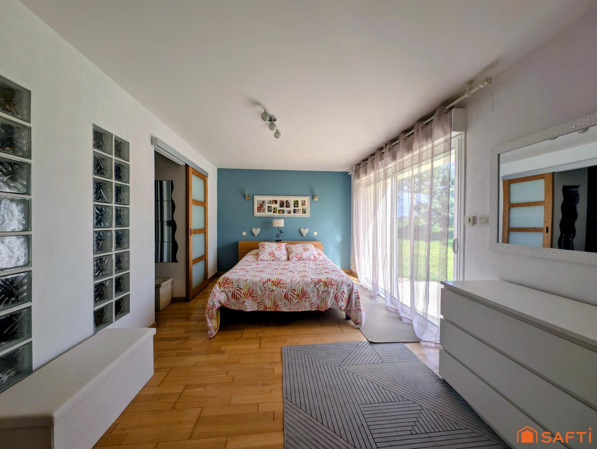 La vie de plain-pied est idéale grâce à une suite parentale avec dressing, salle d’eau et WC. L’étage accueille trois chambres, un bureau ainsi qu’une salle de bains et WC séparé.