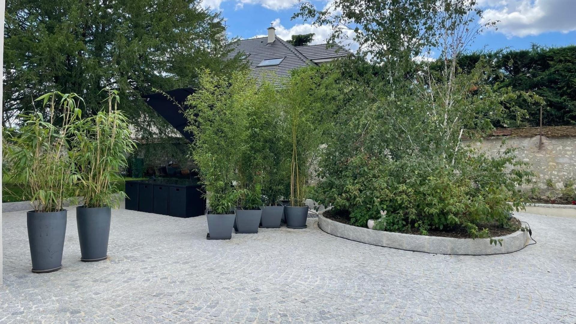 L'EXTERIEUR : Le terrain de 1274 m2 vous offre un jardin fleuri et arboré, une grande terrasse de 100 m2 en petits pavés.