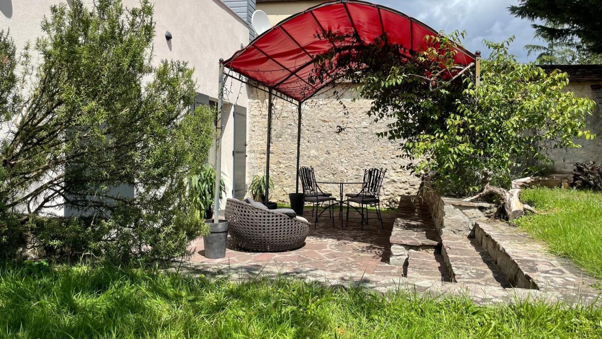 Une deuxième terrasse avec une pergola donne sur le coté de la maison. La chambre du RDC et le bureau y accèdent par 2 baies vitrées.