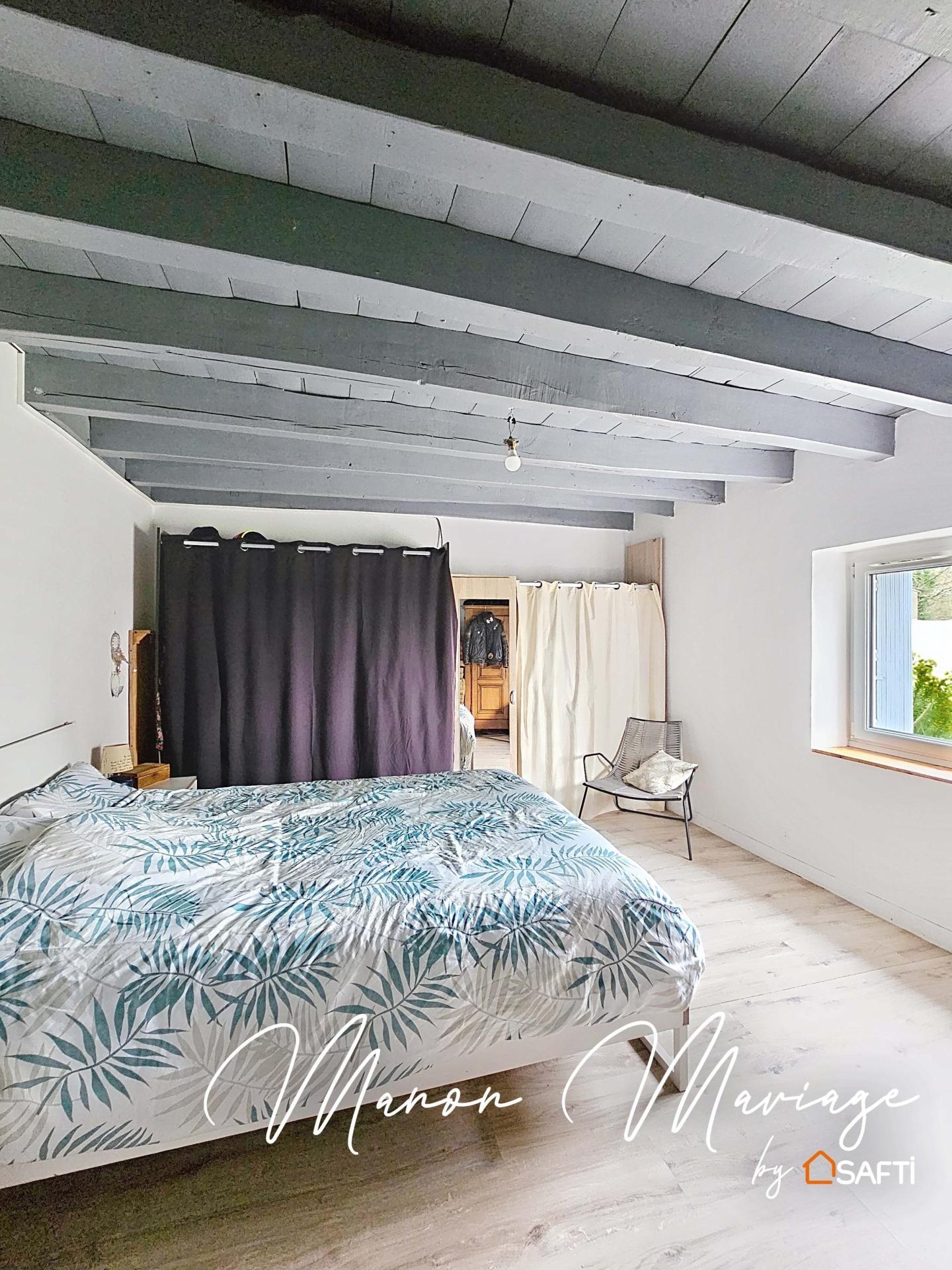 apparentes, un couloir dessert une grande chambre et un atelier de plus de 17 m2 pouvant être aménagé. Dans