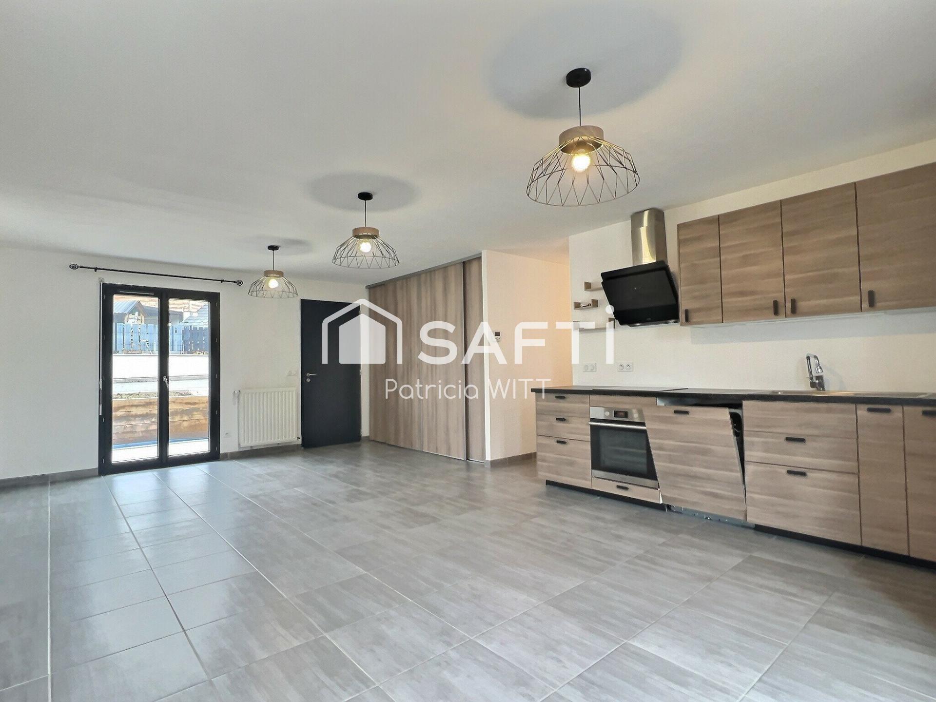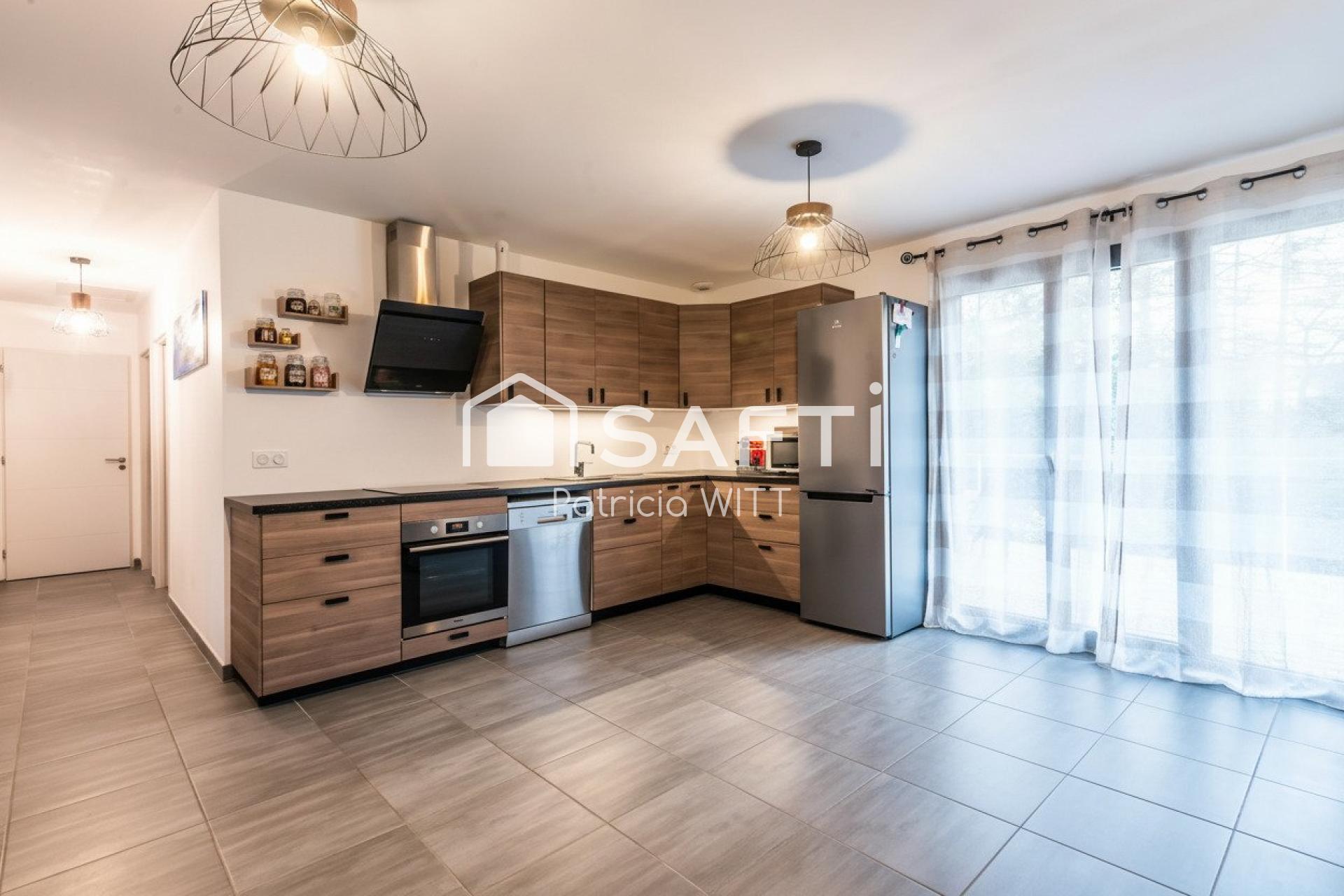 Maison ossature bois (constructeur NATALIA, 1er réseau de constructeur de maisons en ossature bois) d'environ 76m2 sur une parcelle de 526m2 orientée Sud/Est (vue sur la forêt), de belles prestations, sous garantie décennale jusqu'en 2030: carrelage 40X40 dans le salon, salle à manger, cuisine équipée (le tout sur 36m2), salle de bain, wc et parquet stratifié dans les 3 chambres (11m2 chacune), placards intégrés dans les chambres, fenêtres alu.