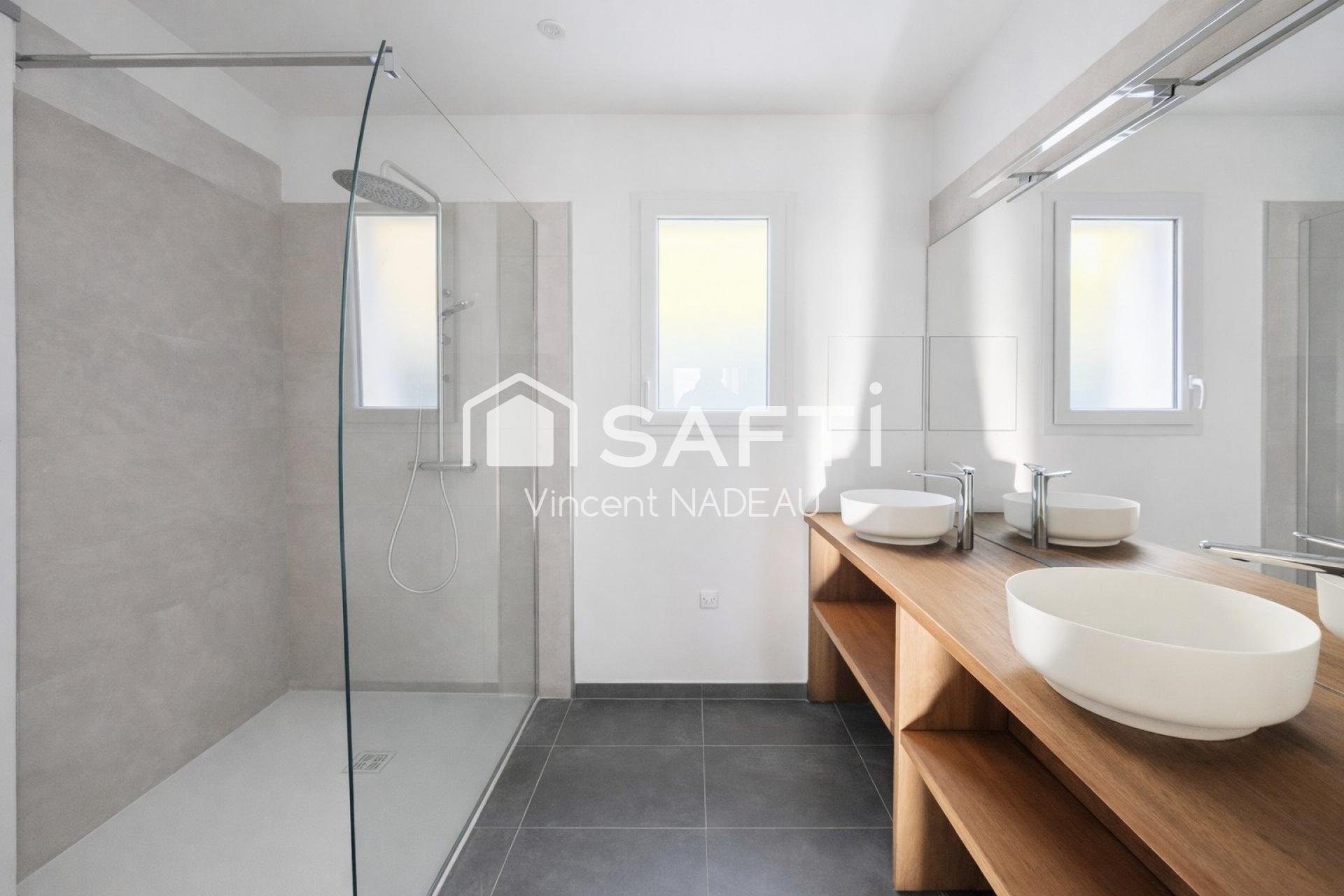 L’espace nuit se compose d’une suite parentale avec salle d’eau privative et accès direct à l’extérieur, complétée par trois chambres supplémentaires et une seconde salle d’eau moderne avec double vasque et douche extra-plate.