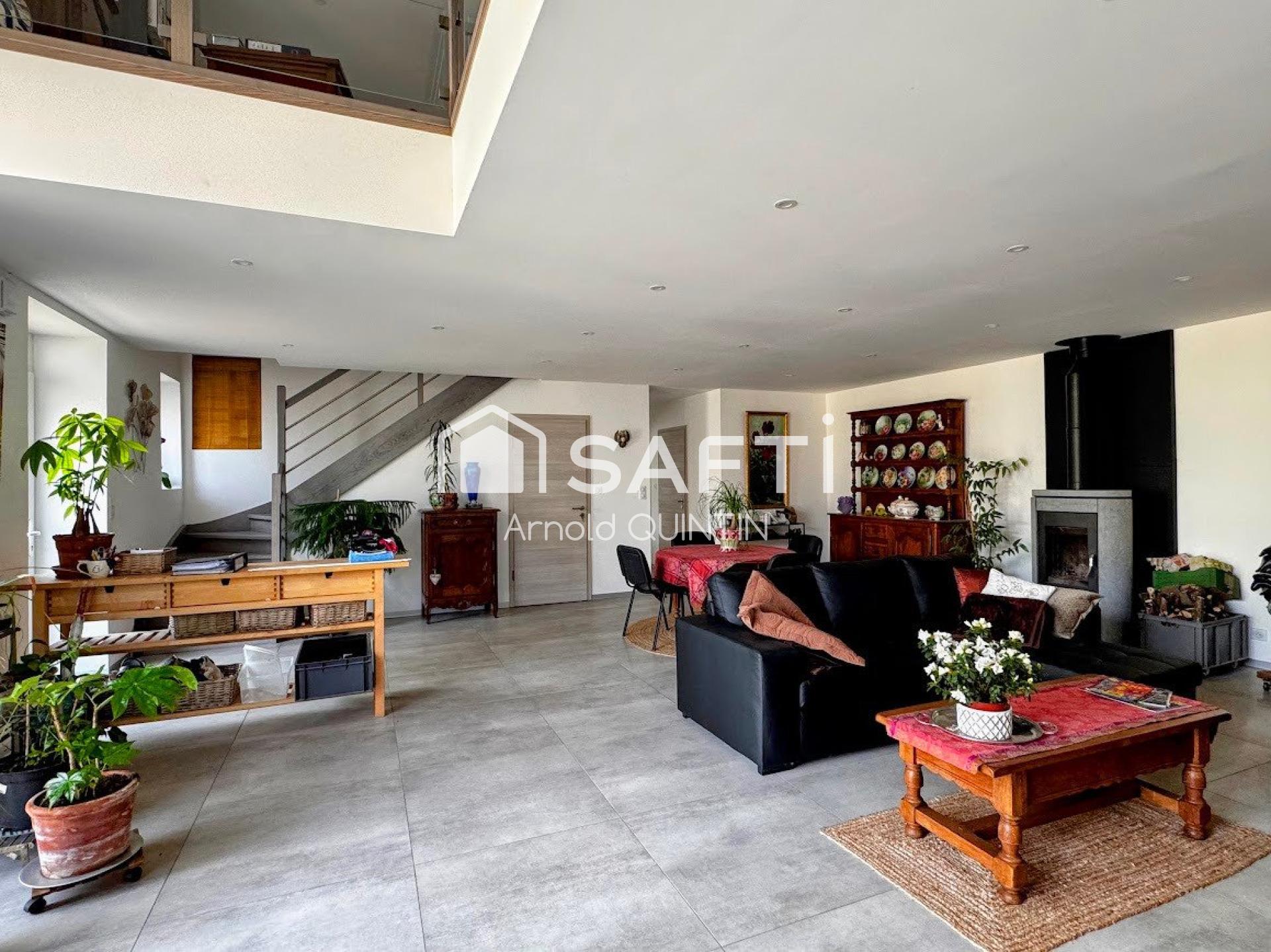 Au rez-de-chaussée, vous profiterez d’un vaste séjour lumineux de 54 m² agrémenté d’un poêle à bois, ainsi que d’une cuisine ouverte, moderne et entièrement équipée.