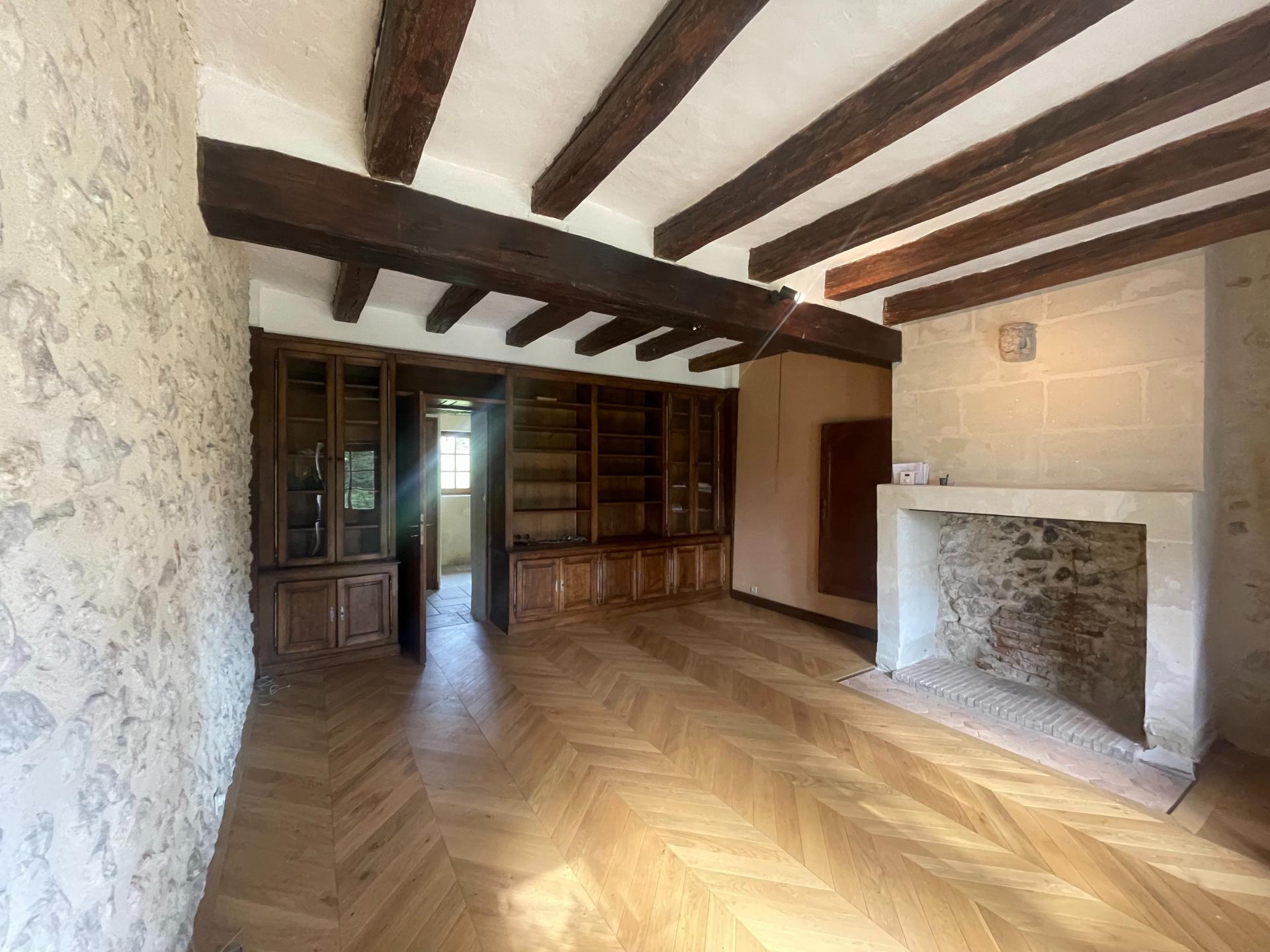 au rez-de-chaussée : Double séjour dont une grande pièce à vivre de 46 m2 avec cheminée à foyer ouvert, une cuisine aménagée et équipée avec accès terrasse orientée Sud, un bureau, une chambre et une salle d'eau.
