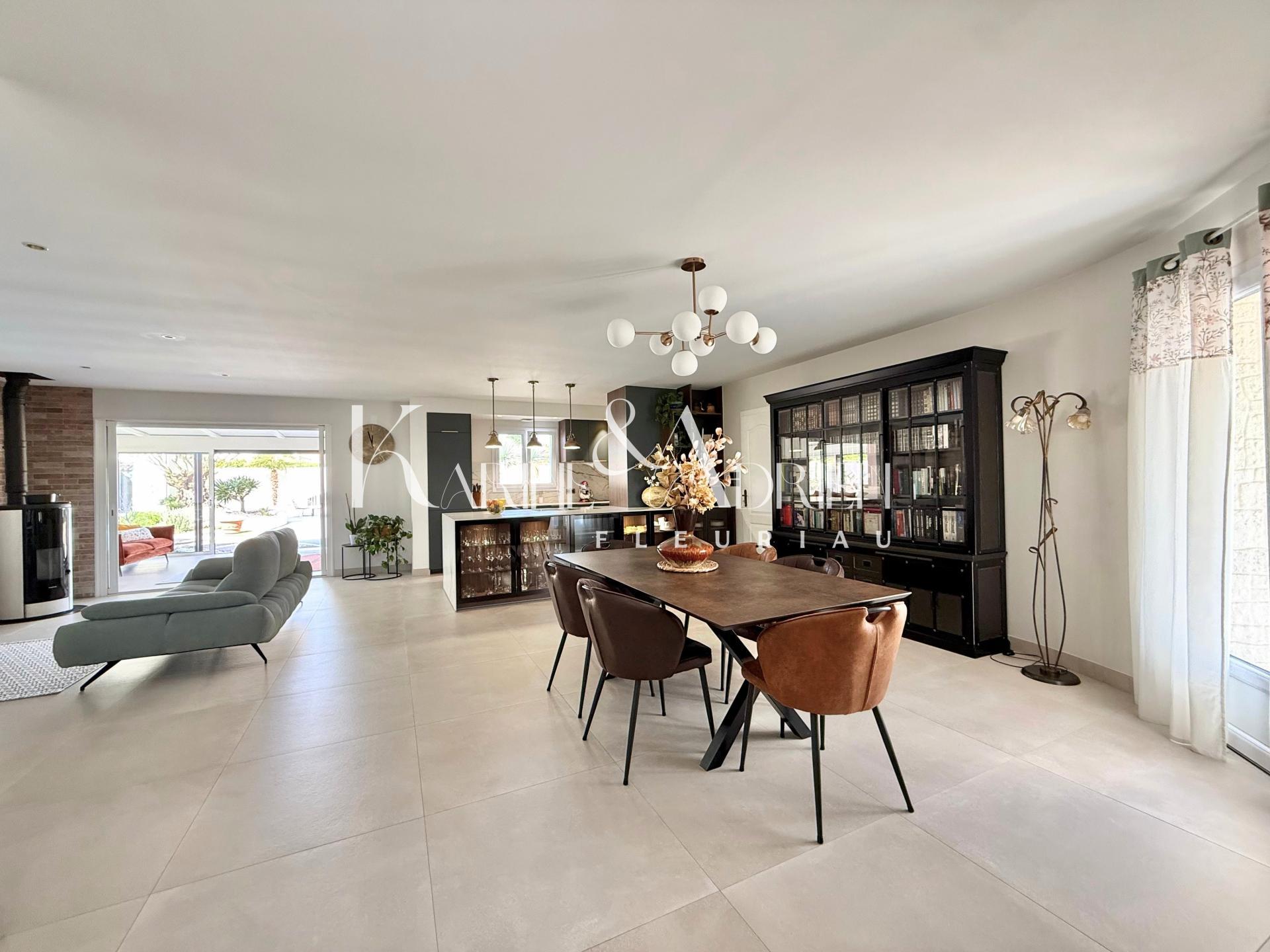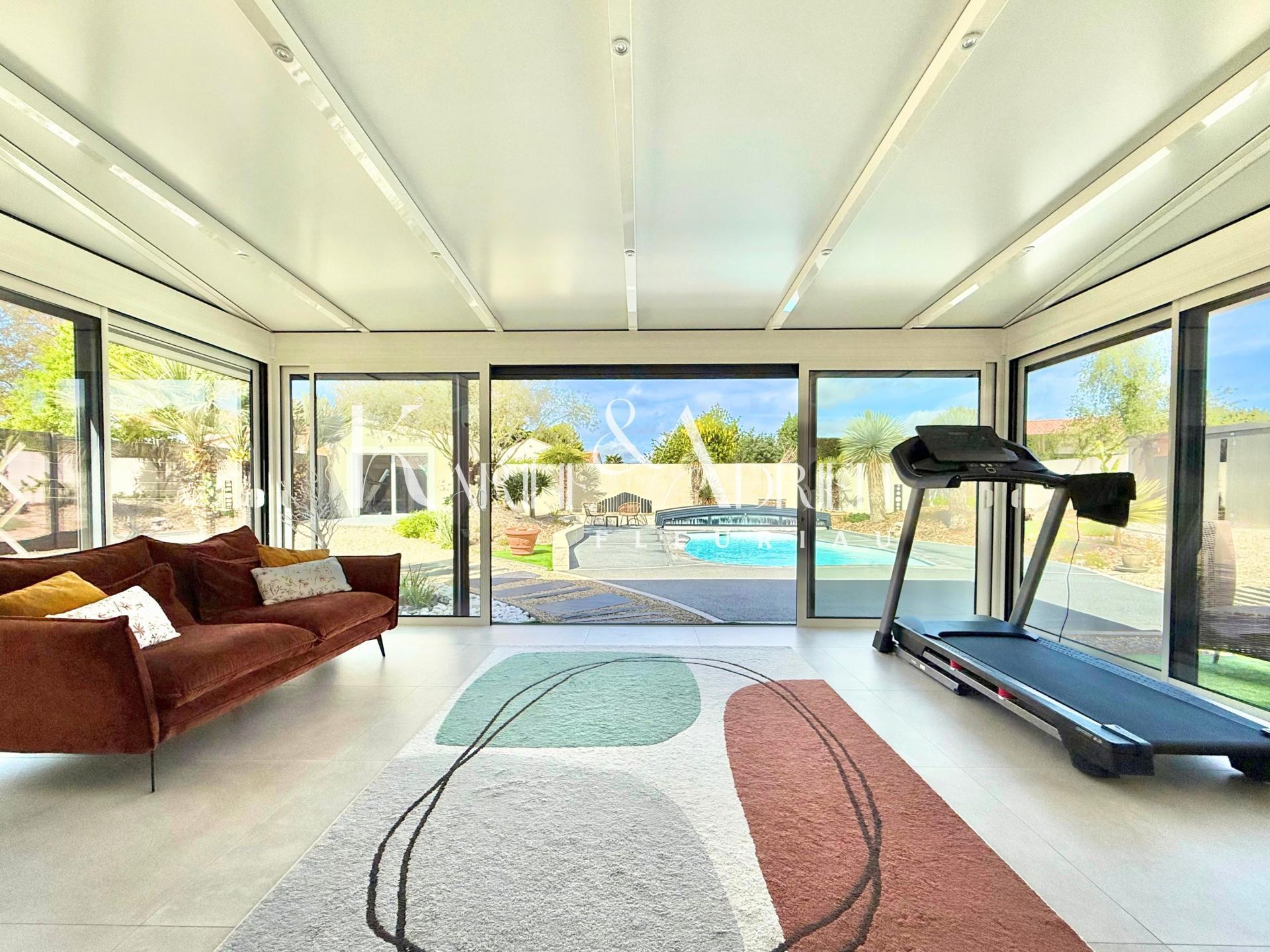 Une grande baie à galandage s'ouvre sur une véranda chauffée/climatisée de 22m2 offrant une vue panoramique sur la piscine et les extérieurs paysagés avec goût.