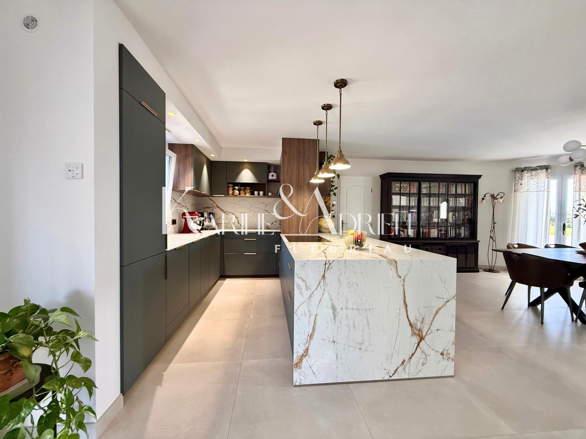 Elle vous propose : une entrée avec dressing, une spacieuse pièce de vie climatisée de 60m2 avec poêle à pellets ouverte sur une somptueuse cuisine aménagée/équipée aux prestations haut de gamme.