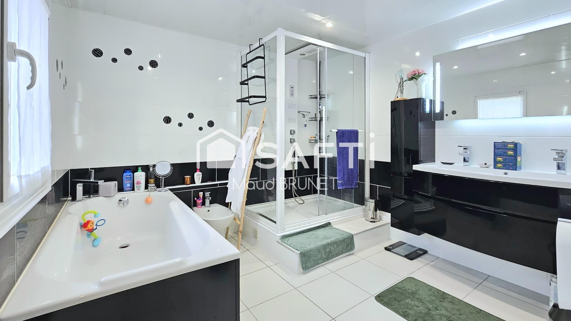 À l'étage, la maison dispose de trois belles chambres, de deux salles de douche dont l’une avec un espace dressing, d’un bureau et de toilettes séparés. Le garage, intégré à la maison, offre une belle capacité de rangement avec un grenier au-dessus, et peut accueillir deux véhicules.
