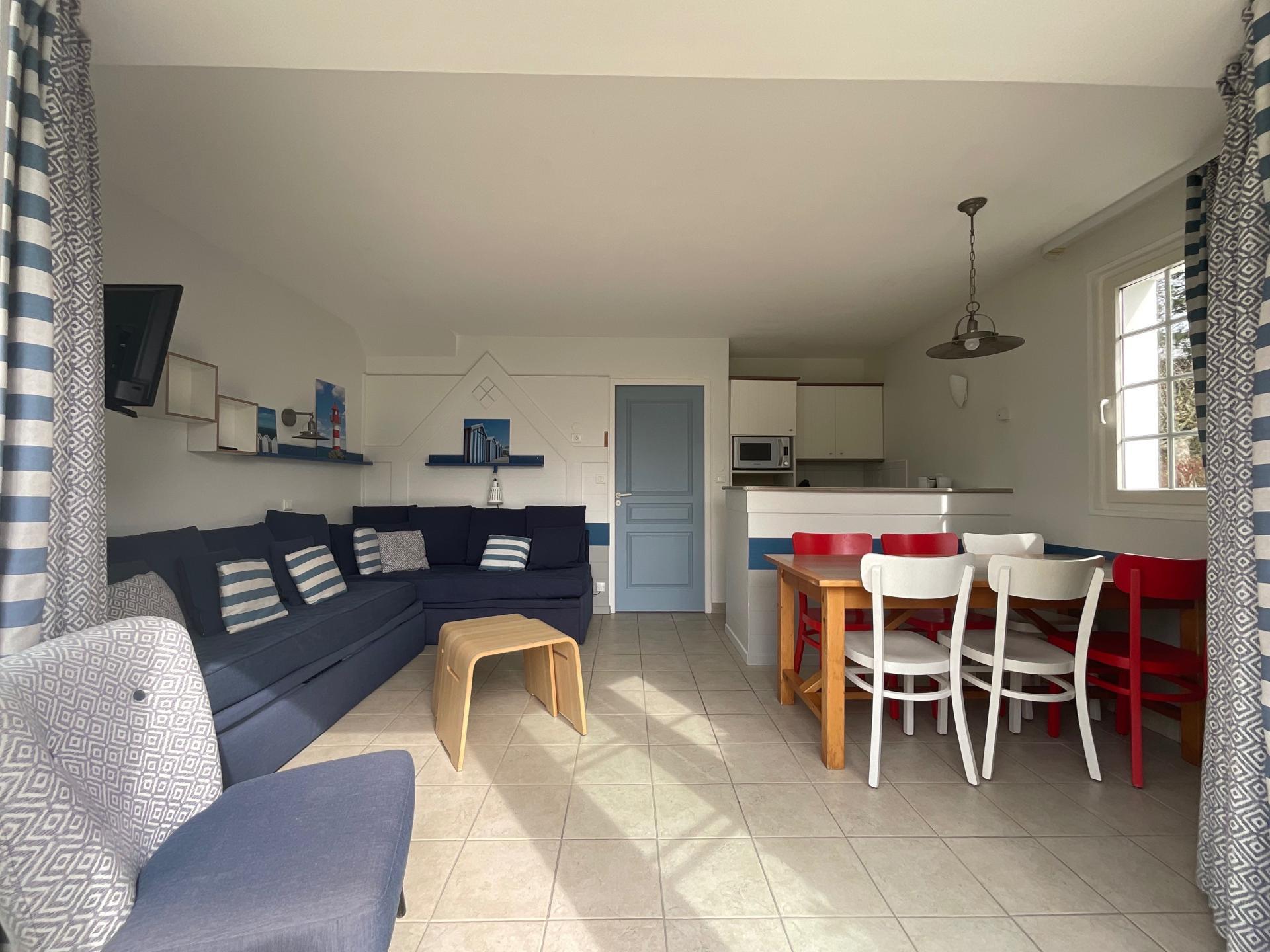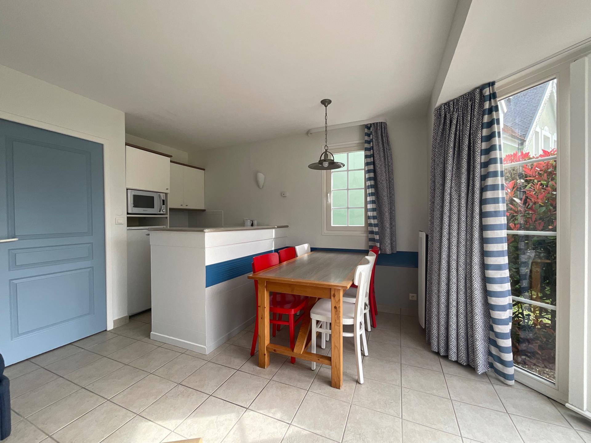 Cette maison meublée, semi-mitoyenne de 42 m², dispose de deux chambres, une salle de bain, d’un séjour (avec bow Window) ouvert sur la cuisine, d’une terrasse offrant un espace extérieur appréciable.