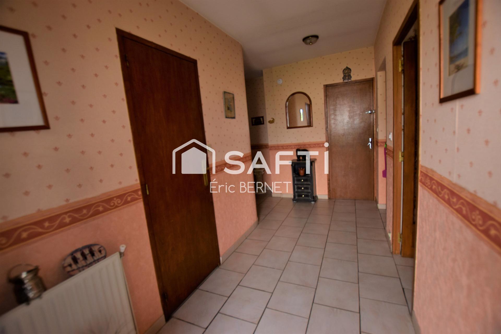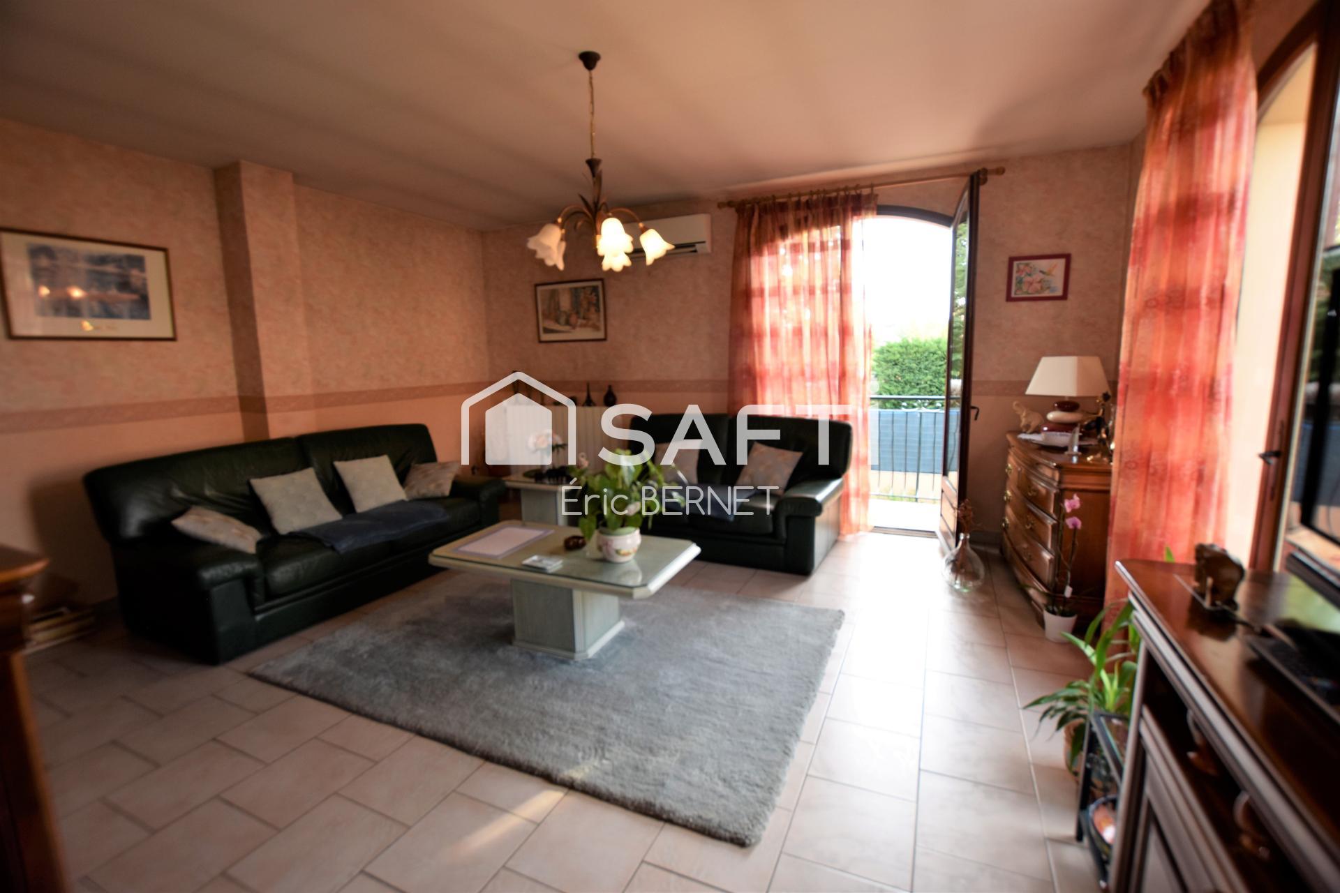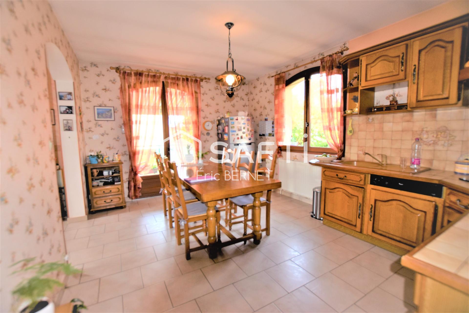 Genas Est lyonnais en Exclusivité .Maison familiale de 135 m² environ sur 800 m² arboré ,au calme proche du centre , à proximité des transports en fond d 'impasse .Cette maison se compose de plain pied, possède une vaste entrée , toilettes , une cuisine équipée semi ouverte avec porte fenêtre donnant sur la terrasse , un séjour avec de nombreuses ouvertures, avec cheminée, trois belles chambres , une salle bains. A l 'étage gros potentiel d 'aménagement , 60 m² environ .En demi sous-sol une salle d' eau , une cuisine d 'été aménagée , une cave . garage double . Chauffage central au fioul.La maison est au calme , aucun vis à vis . La construction d 'une piscine est possible .Une climatisation récente .la maison a du cachet , de beaux volumes à exploiter, seul et unique propriétaire depuis 1984. Quelques travaux de rafraîchissements sont à prévoir