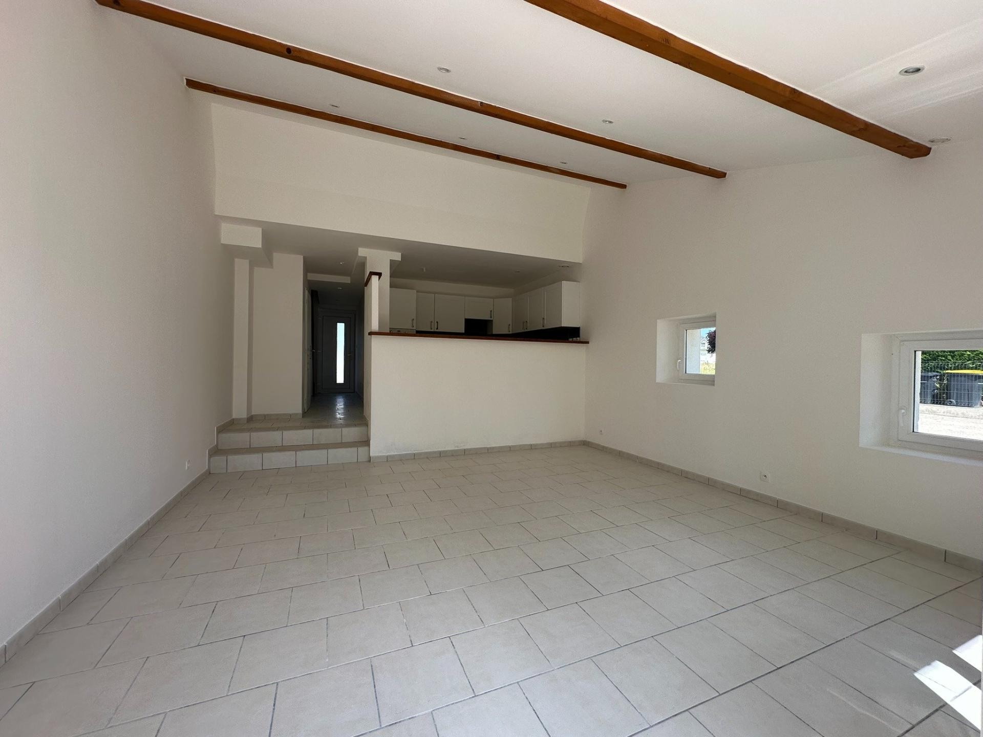 Maison mitoyenne composée au rez-de-chaussée d'un salon/séjour, d'une cuisine aménagée, d'une chambre et des wc. A l'étage, une chambre, un bureau et une salle d'eau.