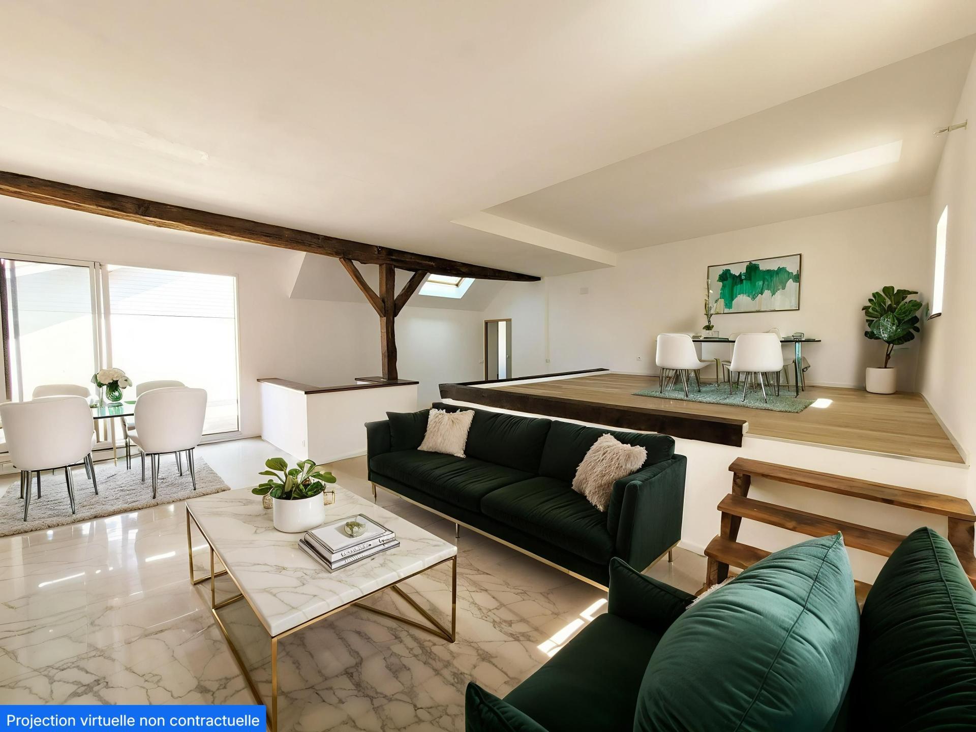 Empruntez l’escalier pour arriver au 1er et découvrez son vaste et lumineux séjour avec poutres apparentes donnant accès à la terrasse de 25 m2. Découvrez également une salle de bain, un wc indépendant, une cuisine ouverte sur la salle à manger, et une pièce pouvant accueillir une buanderie de 10m2.