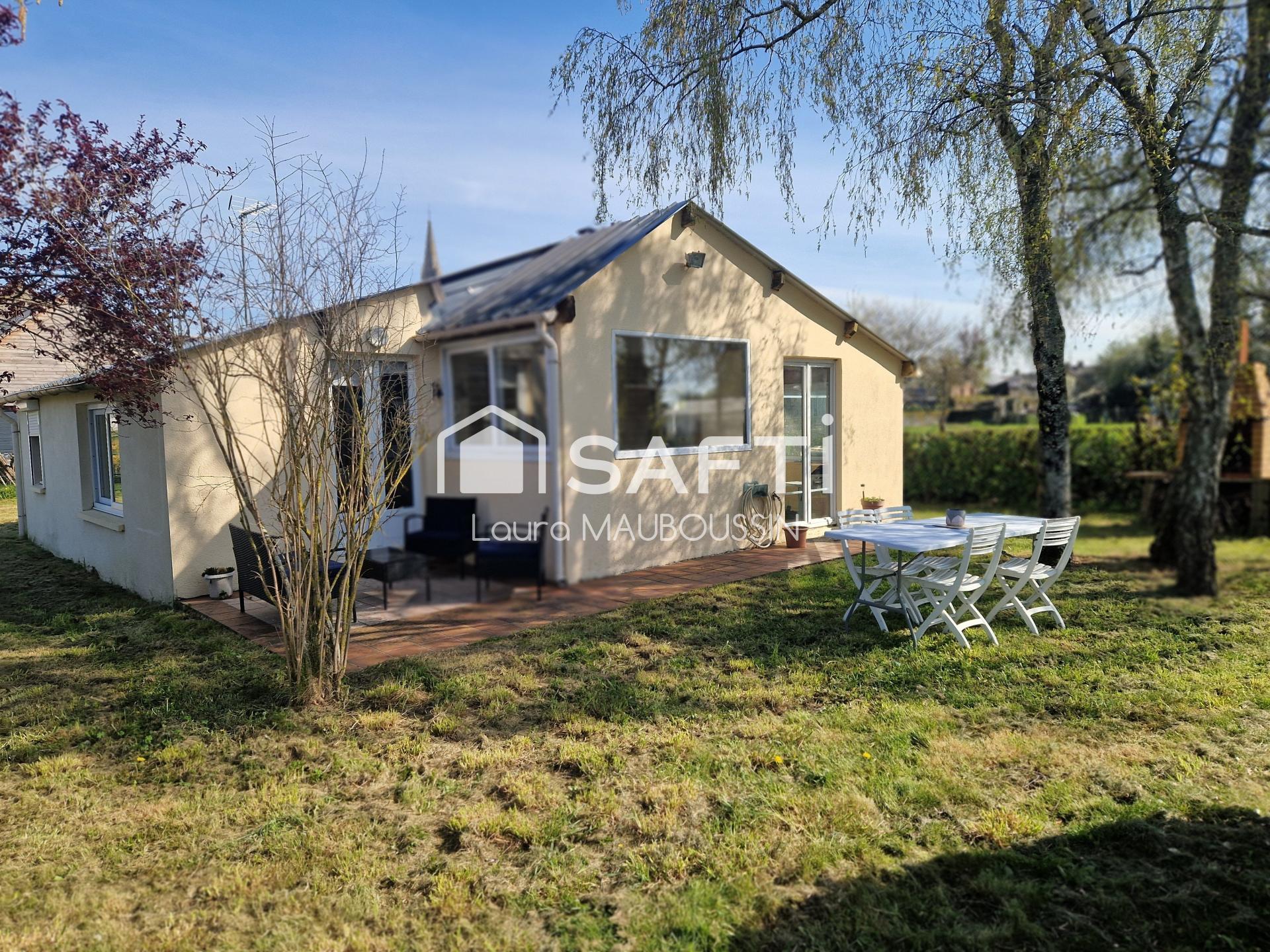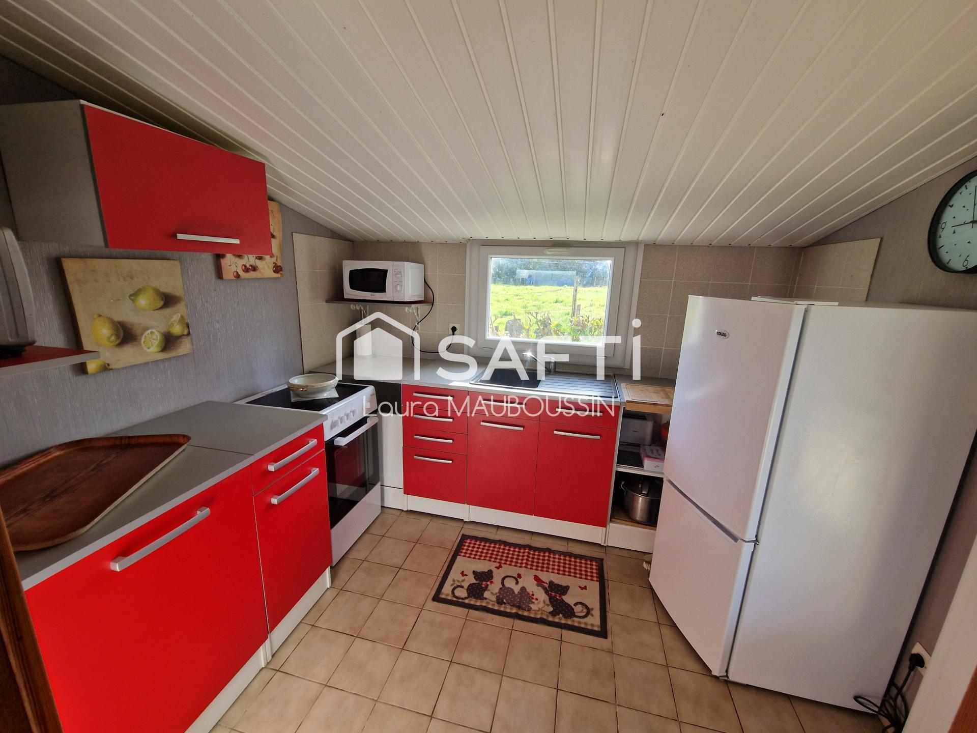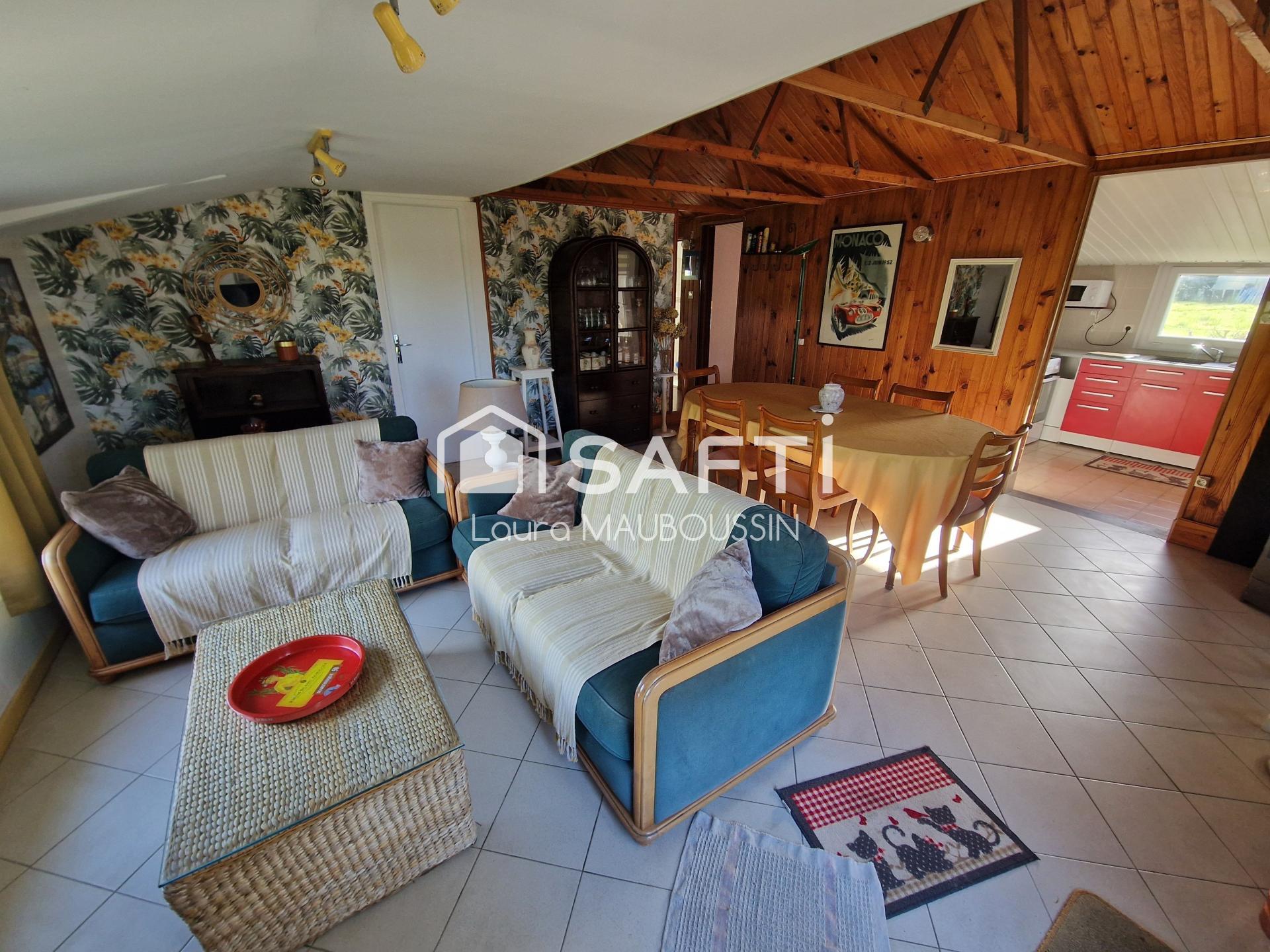 D'une surface de 60 m² sur une parcelle entièrement close de 777 m², ce bien propose un agencement fonctionnel comprenant un salon-séjour équipé d'un poêle à bois, d'une cuisine, de deux pièces de moins de 9 m² (actuellement utilisées comme chambre), d'un bureau et d'une salle de bain avec WC