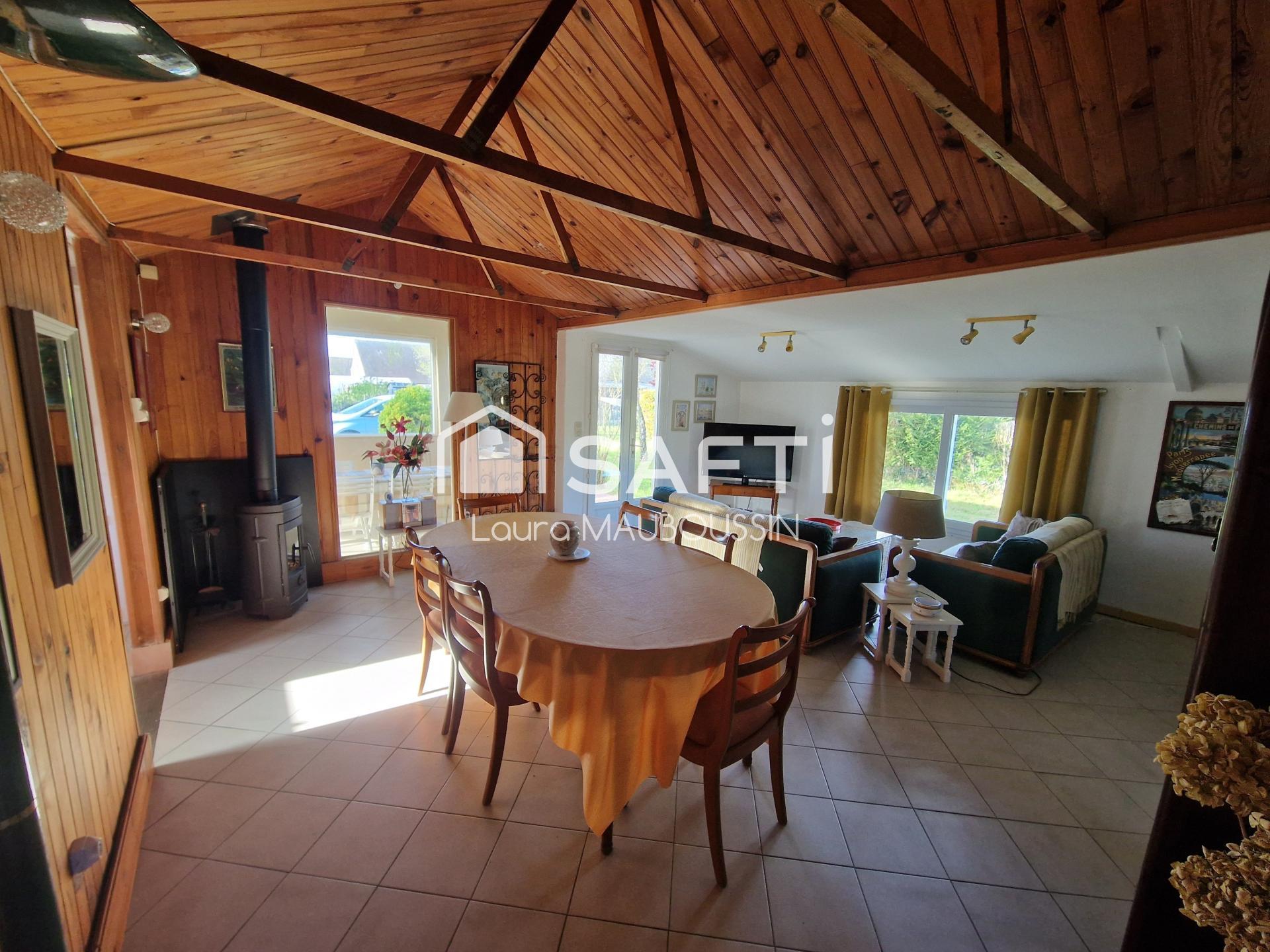 Située à Grand-Auverné (44520), cette maison-chalet atypique offre un cadre de vie paisible et verdoyant, idéal pour les amoureux de la tranquillité tout en restant à proximité des commerces et services essentiels (boulangerie-épicerie, école, coiffeuse, MAM et restaurant).