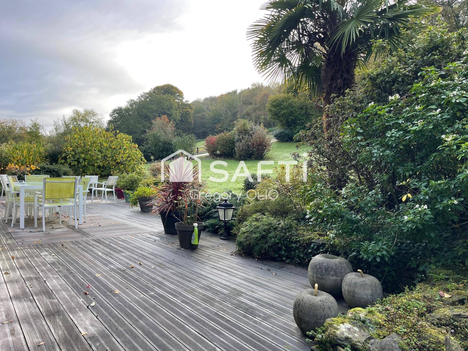 Un jardin paysagé, clos et arboré, complété d'une terrasse exposée sud, d'une grande dépendance avec un point d'eau et un grenier accessible de l'extérieur, de places de parking et de deux cabanons de jardin.
