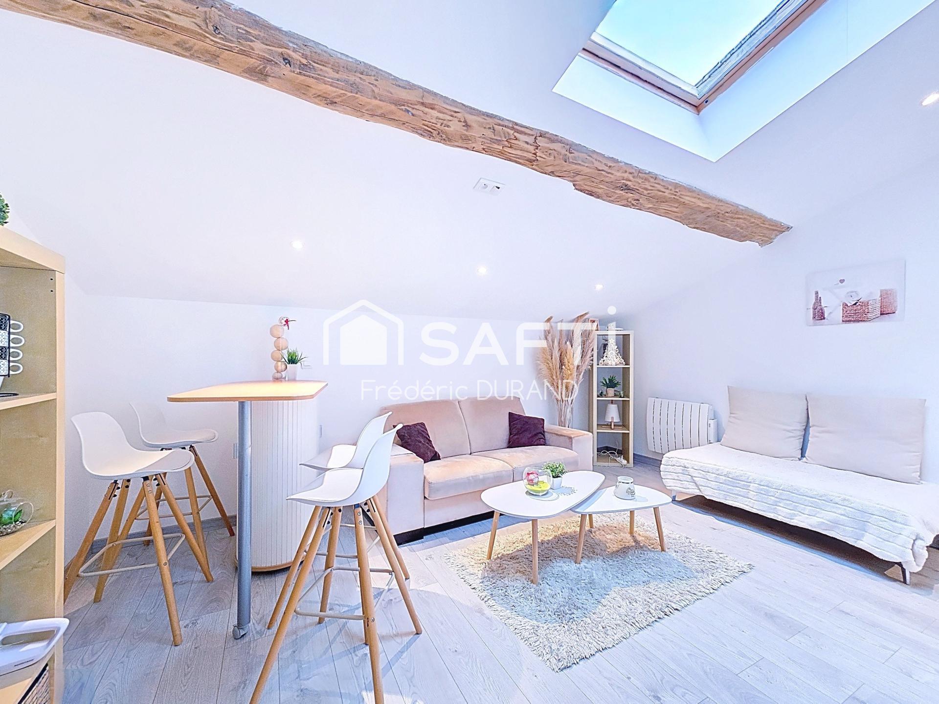 Belle pièce de vie traversante de 32 m² avec cuisine ouverte équipée, salon-séjour, 1 chambre de plain-pied d'environ 12m², salle d’eau moderne, WC.