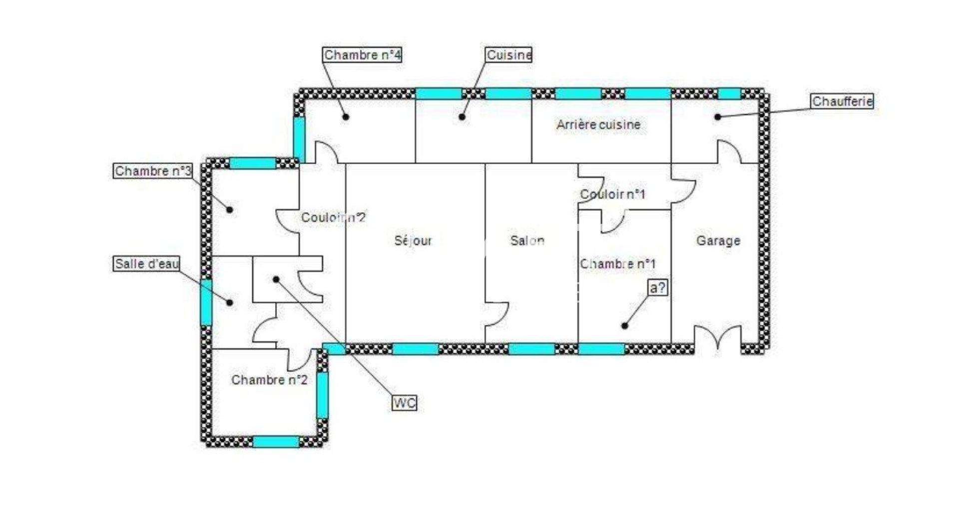 Entrée sur salle à manger/séjour avec insert bois, cuisine séparée, dégagement, quatre chambres, salon avec cheminée, espace non aménagé côté jardin, chaufferie/buanderie et garage.