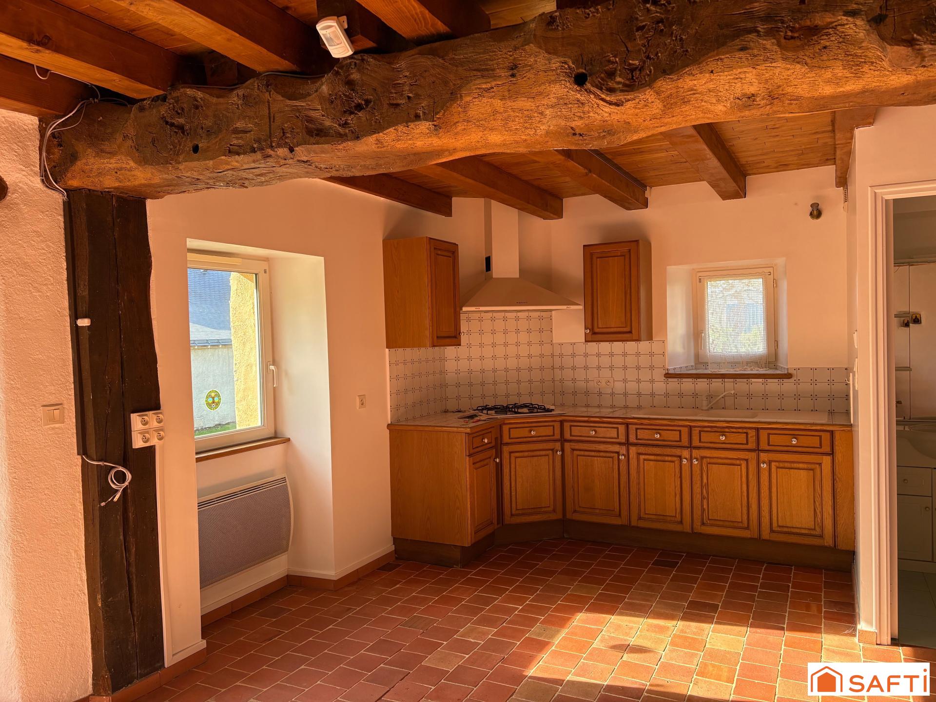 La seconde partie de la maison, accessible par une entrée indépendante, vous séduira elle aussi par son ambiance chaleureuse. Au rez-de-chaussée une cuisine aménagée s'ouvre sur une pièce de vie conviviale réchauffée elle aussi par un poêle à bois qui apporte confort et authenticité. Une salle de bains équipée d'une baignoire et d'une douche, ainsi qu'un dégagement faisant office de lingerie, complètent ce niveau. À l'étage, deux belles chambres vous attendent.