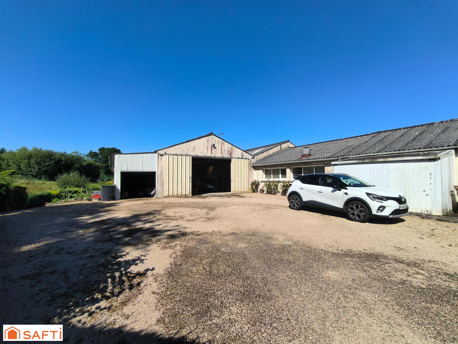 À l'extérieur, cette maison de 123 m² de plain-pied dispose d'un jardin ainsi que d'une cour close accessible depuis le salon séjour grâce à une baie vitrée. De plus, un garage de 104 m², un garage de 33 m² et 200 m² aménageables en logements ou en espace commercial complètent les aménagements extérieurs de cette propriété.